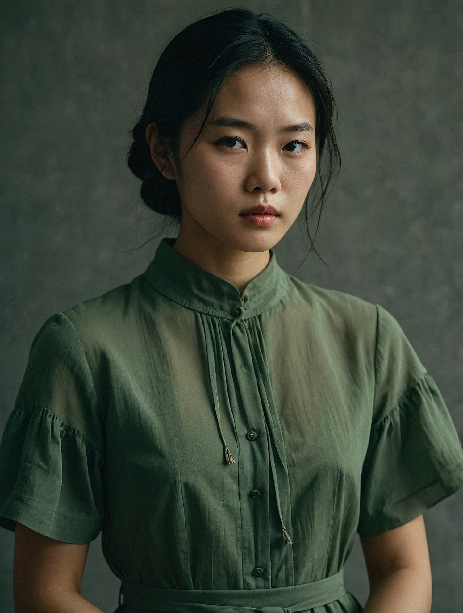 Portrait of an Asian woman in a green dress, with a calm expression and soft lighting, against a textured background.