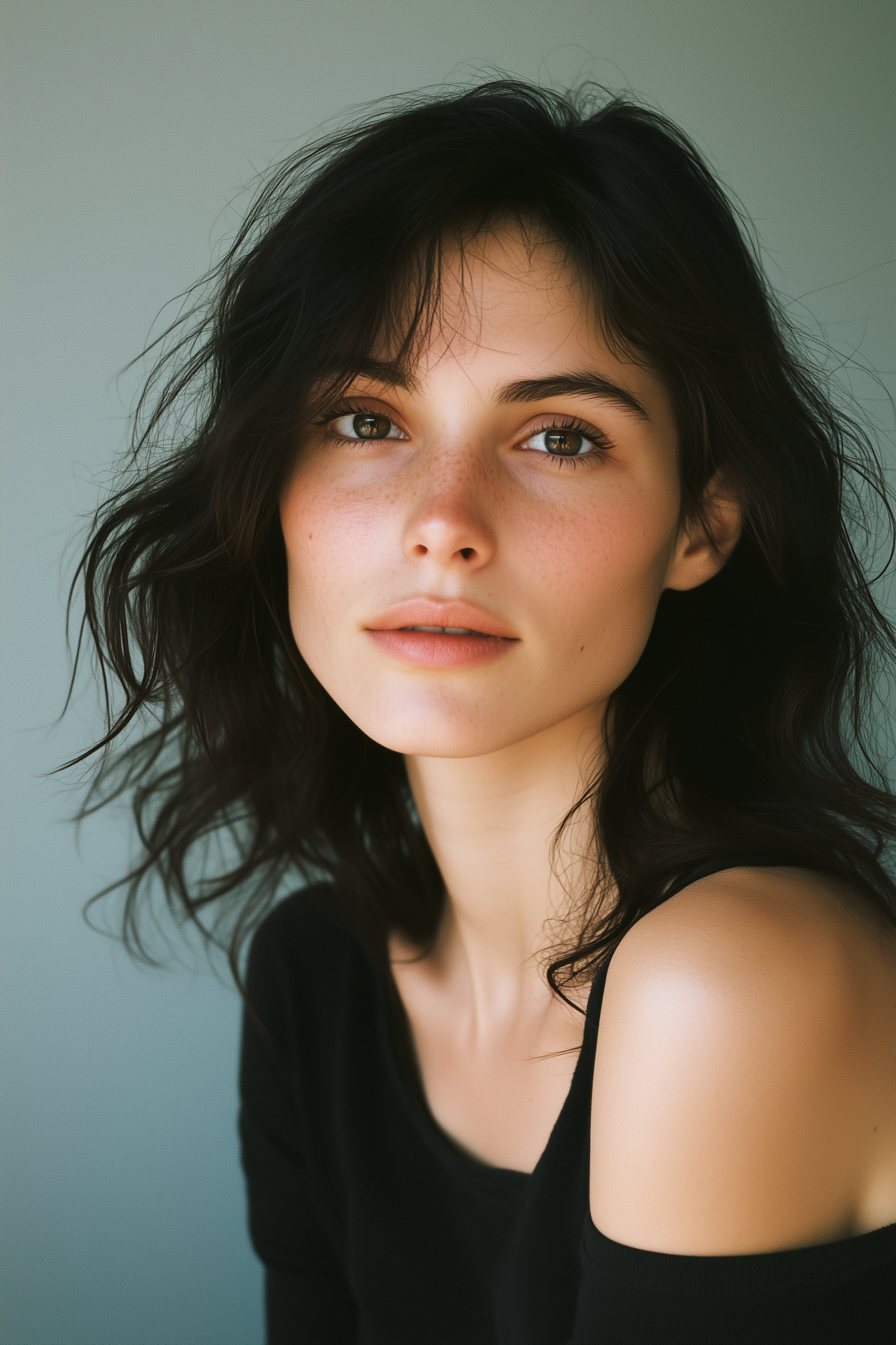 Portrait of a young woman with dark wavy hair and brown eyes, wearing a black top against a soft gray background.