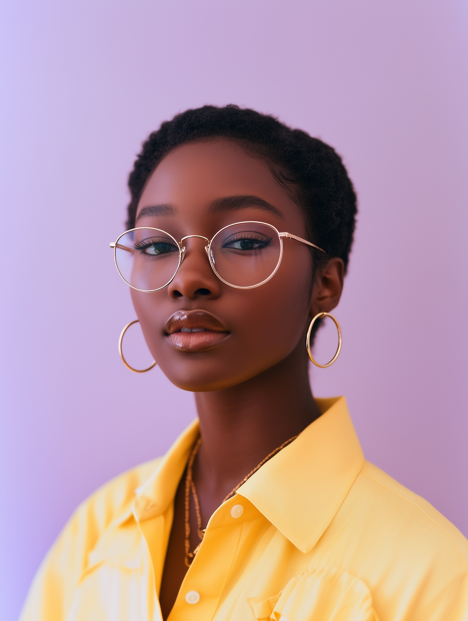 Stylish young woman with glasses and hoop earrings in a yellow shirt against a lavender background, exuding confidence and elegance.