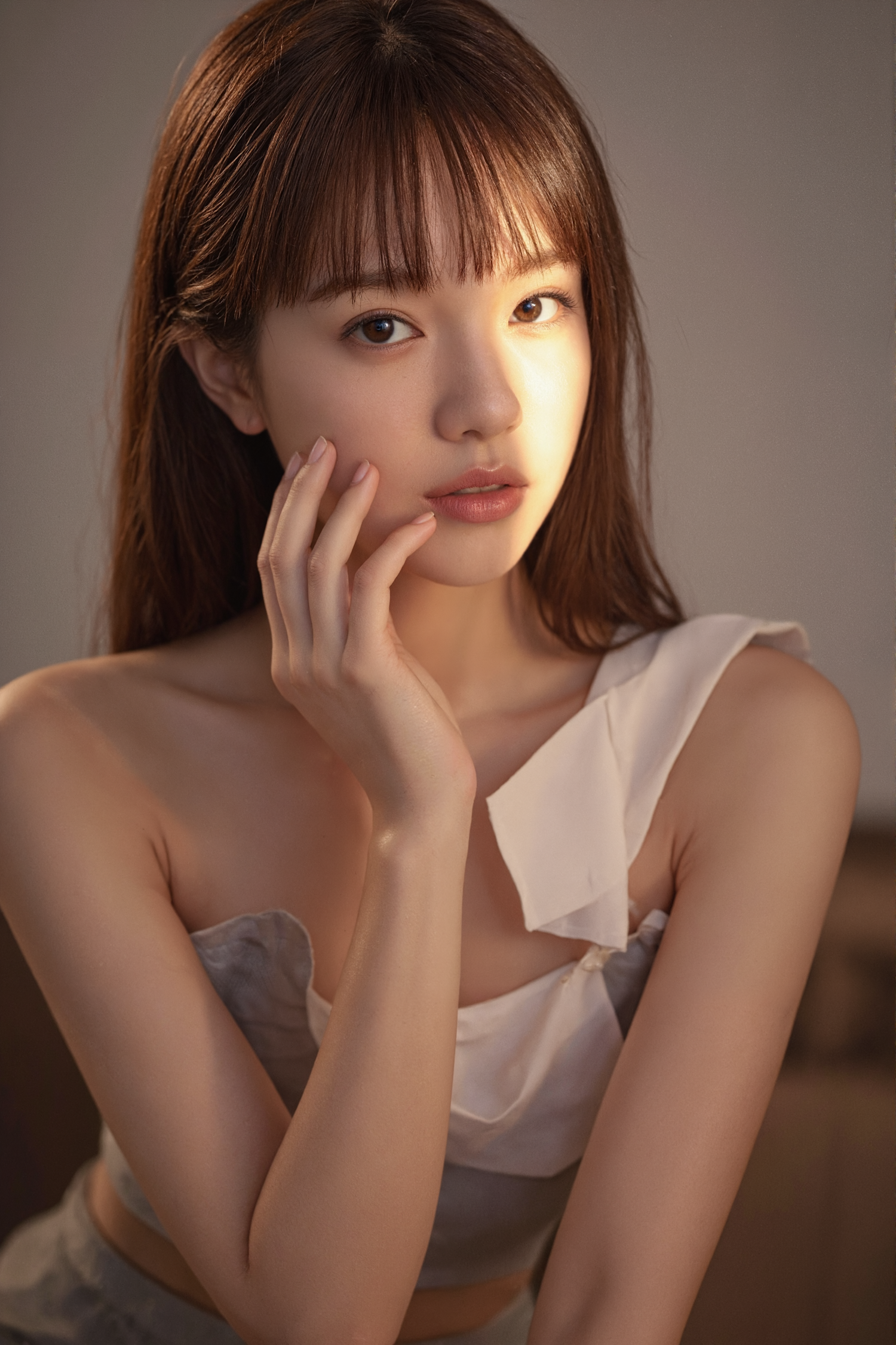 Close-up portrait of an Asian woman with long brown hair, fair skin, and a calm expression, softly lit in a serene setting.