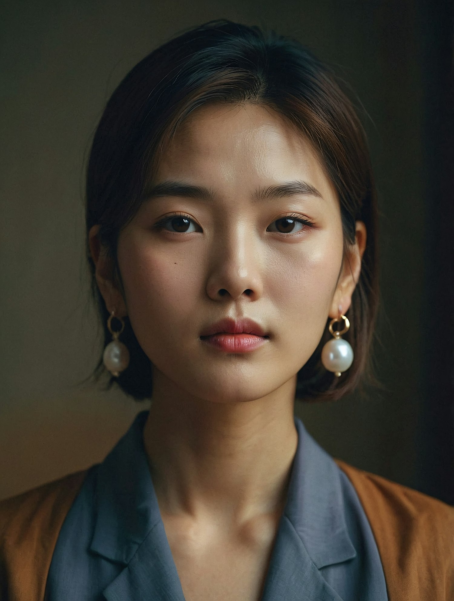 Close-up portrait of an Asian woman with pearl earrings, short dark hair, and a calm expression, wearing a blue-gray shirt and brown jacket.