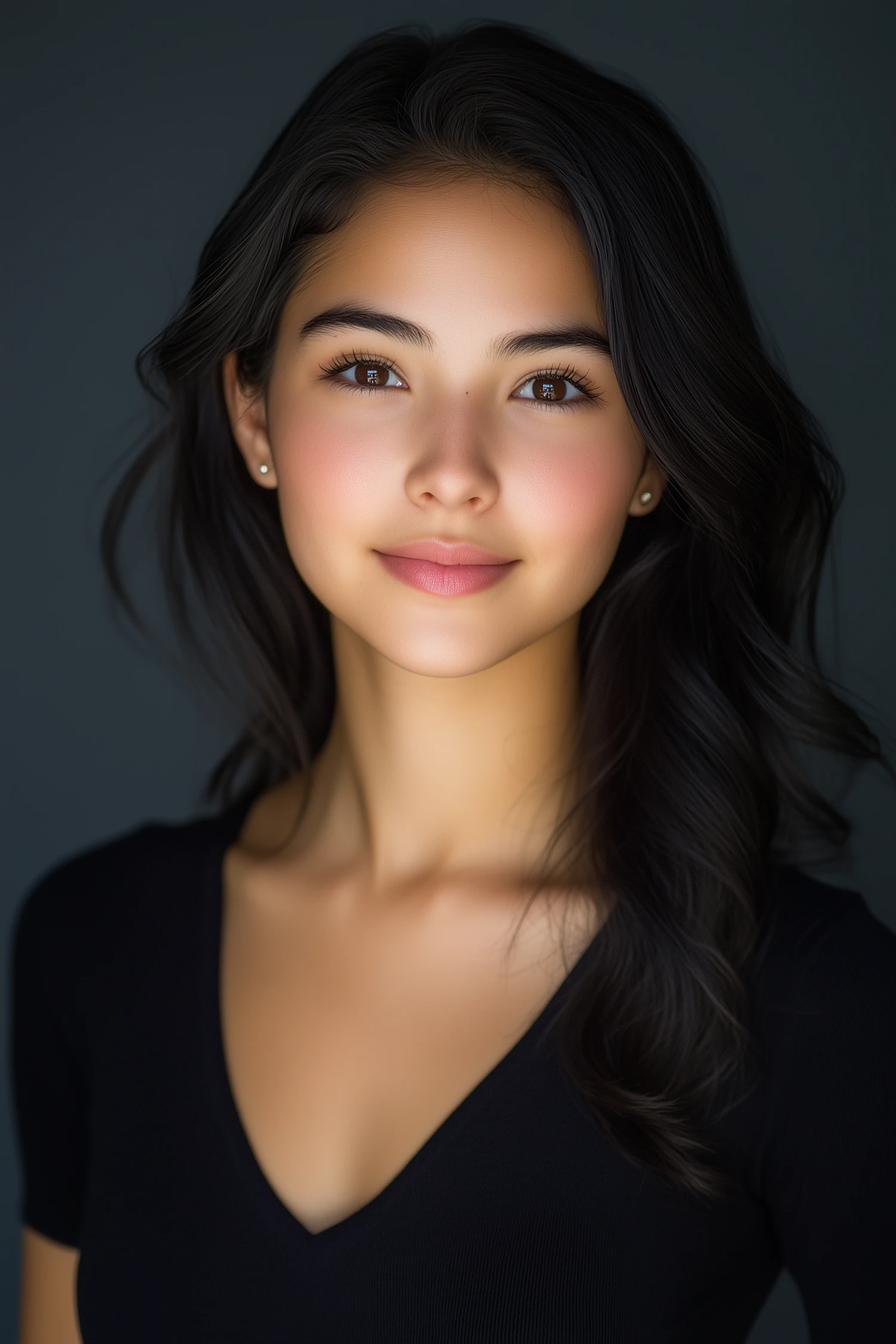Portrait of a young woman with long dark hair, fair skin, and a serene expression against a dark gray background.