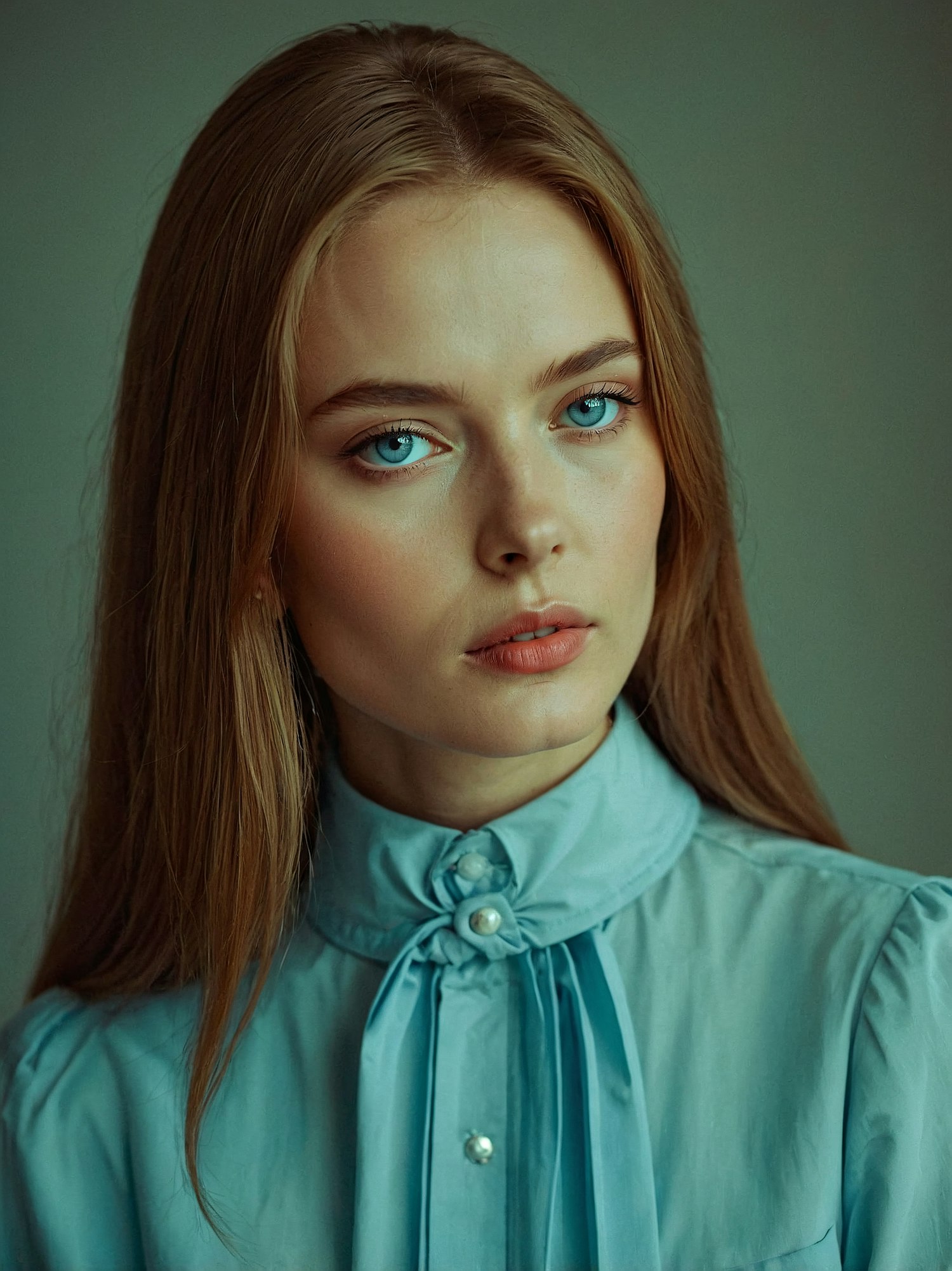 Portrait of a young woman with blue eyes and light brown hair in a blue blouse, set against a muted green background.
