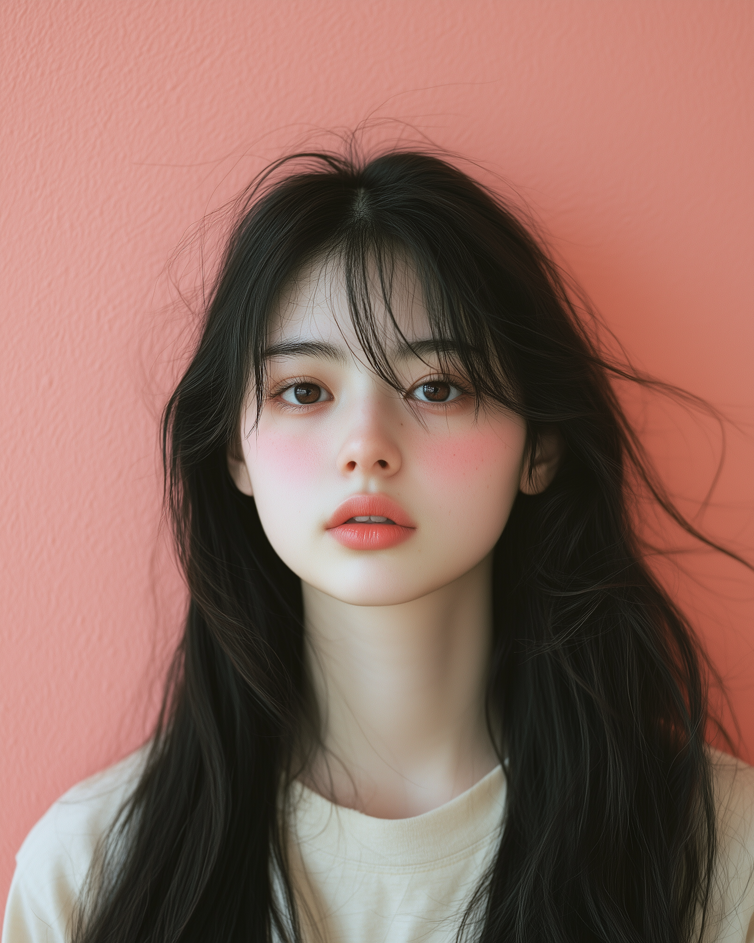 Portrait of a young Asian woman with long dark hair against a pink background, showcasing natural beauty and serene expression.