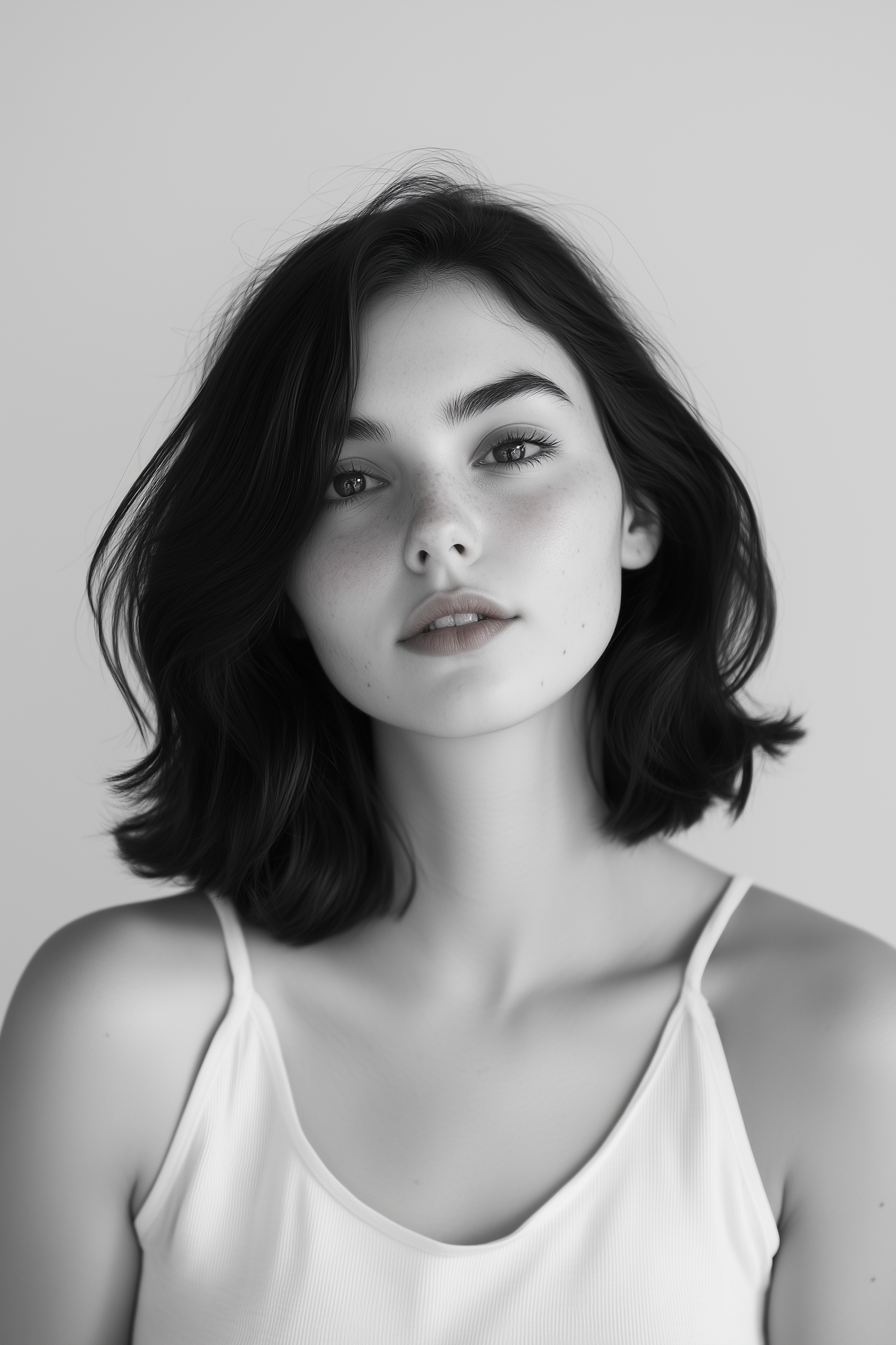 Portrait of a young woman with dark hair and fair skin, wearing a white top against a light background.