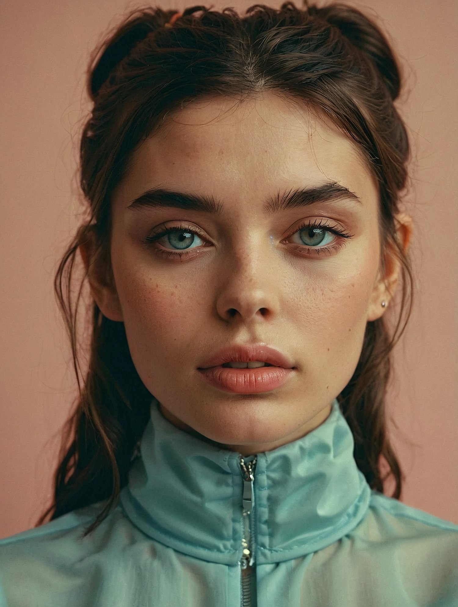 Portrait of a young woman with blue eyes and brown hair, wearing a light blue jacket against a peach background.