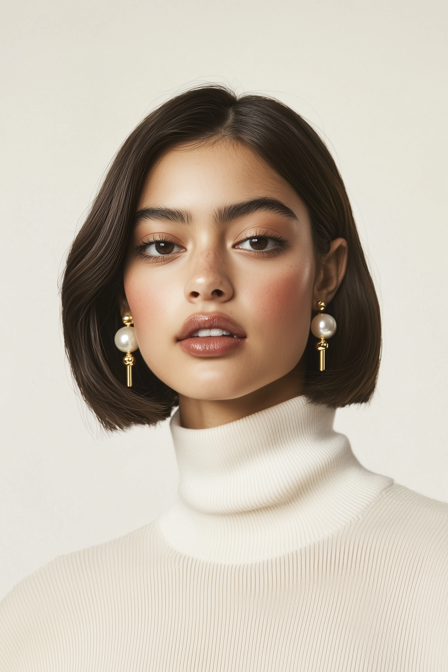 Elegant woman with sleek bob hairstyle, pearl earrings, and white turtleneck, exuding sophistication against a neutral background.