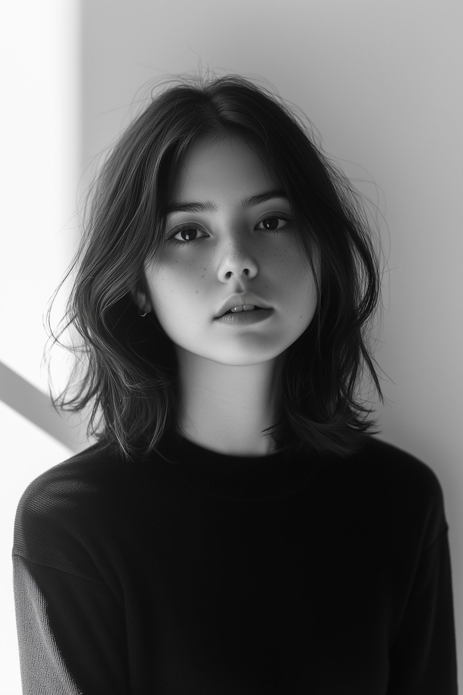 Portrait of a young woman with dark hair and freckles, wearing a black top against a softly lit background.