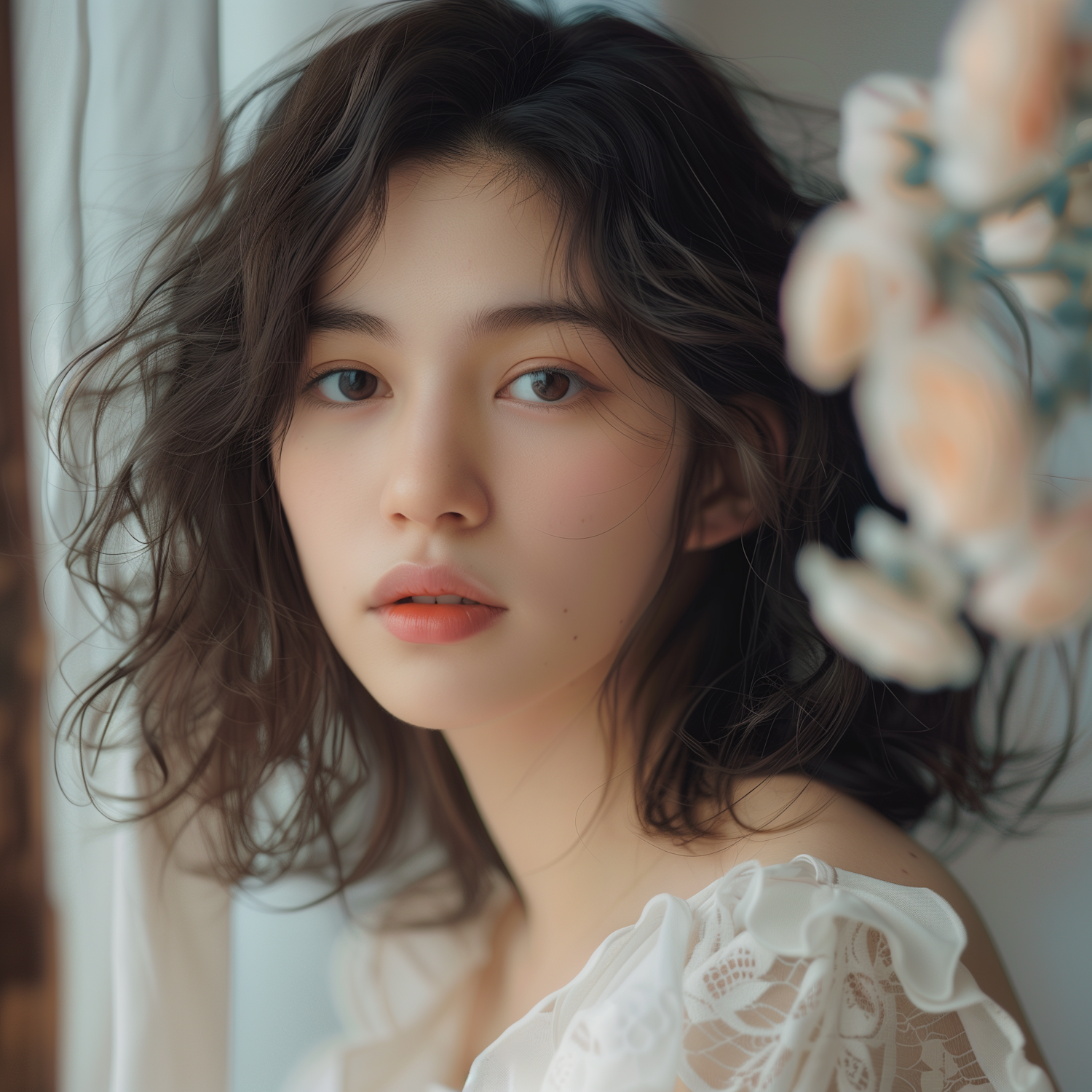 Portrait of a young Asian woman with wavy hair and a white lace top, surrounded by soft pink flowers in a serene setting.