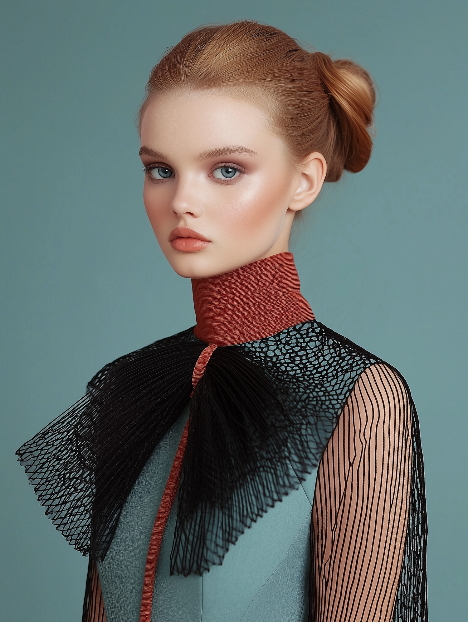 Elegant portrait of a woman with a stylish bun and intricate black mesh cape against a teal background.
