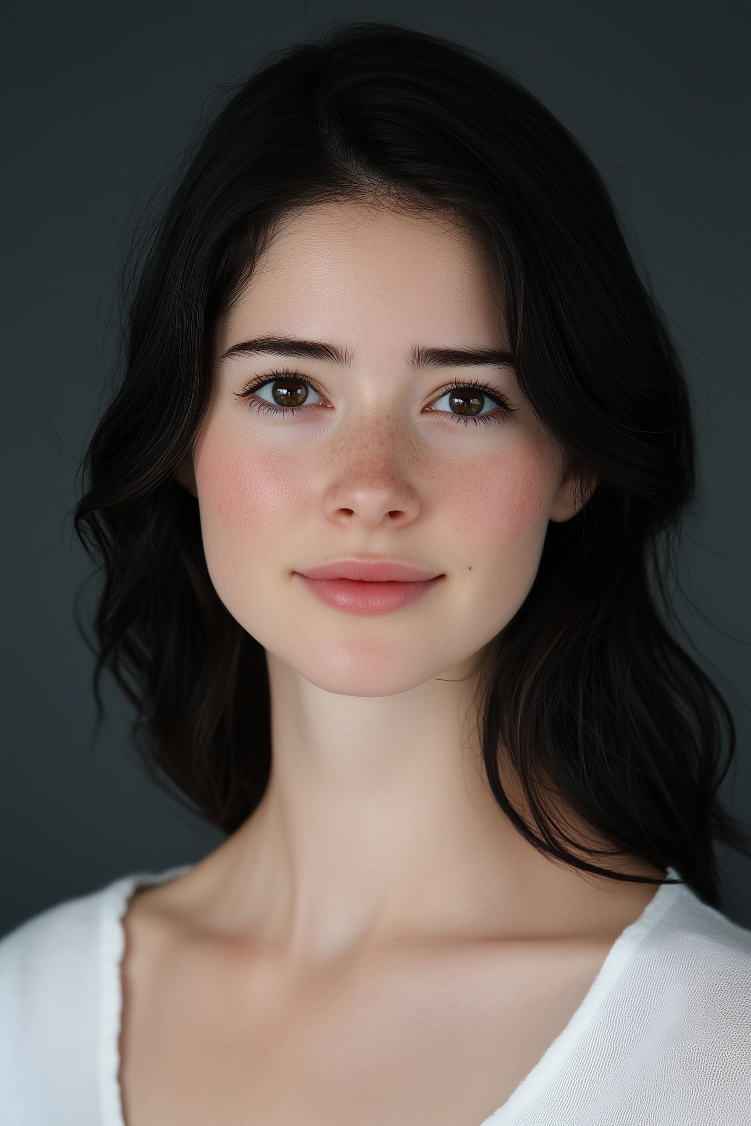 Portrait of a young woman with dark hair and brown eyes, wearing a white top against a gray background.