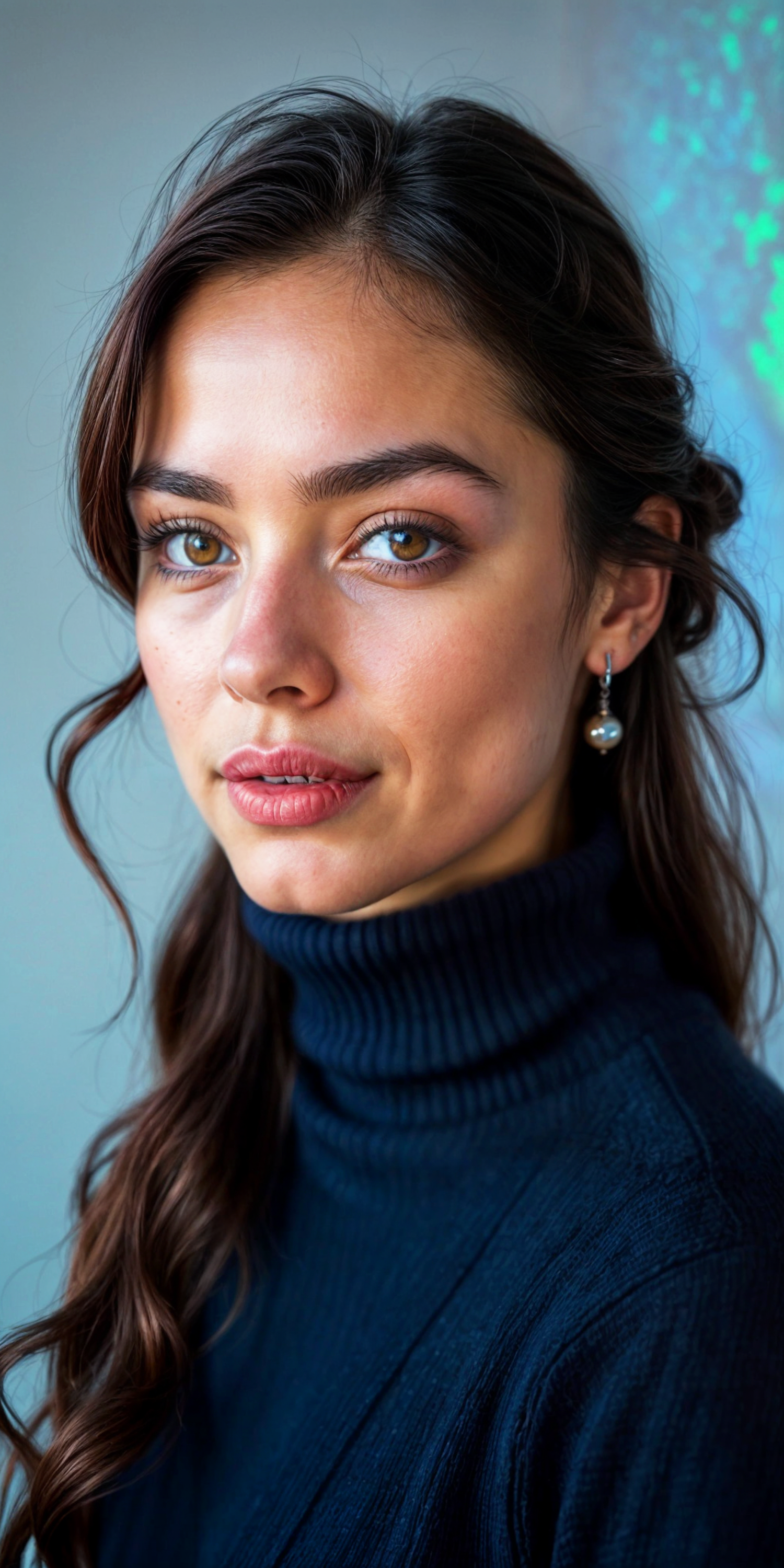 Portrait of a young woman with hazel eyes and wavy brown hair, wearing a dark blue turtleneck. Soft, serene background.