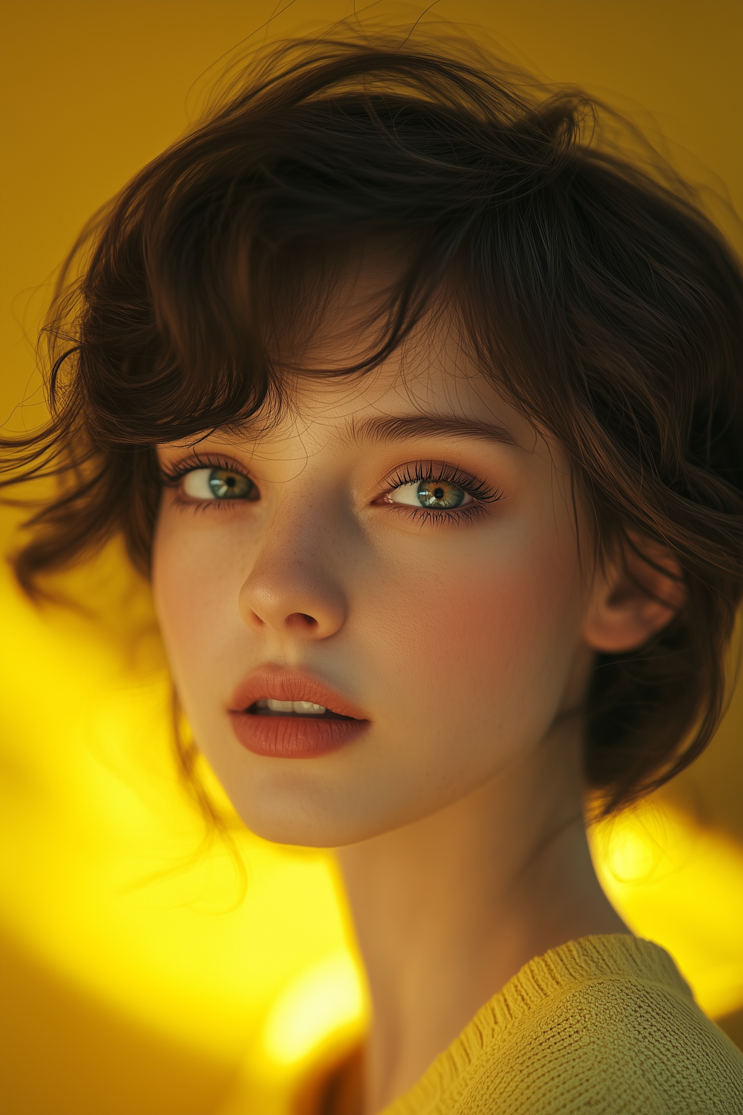Portrait of a young woman with green eyes and wavy brown hair against a warm yellow background, exuding a serene and contemplative vibe.