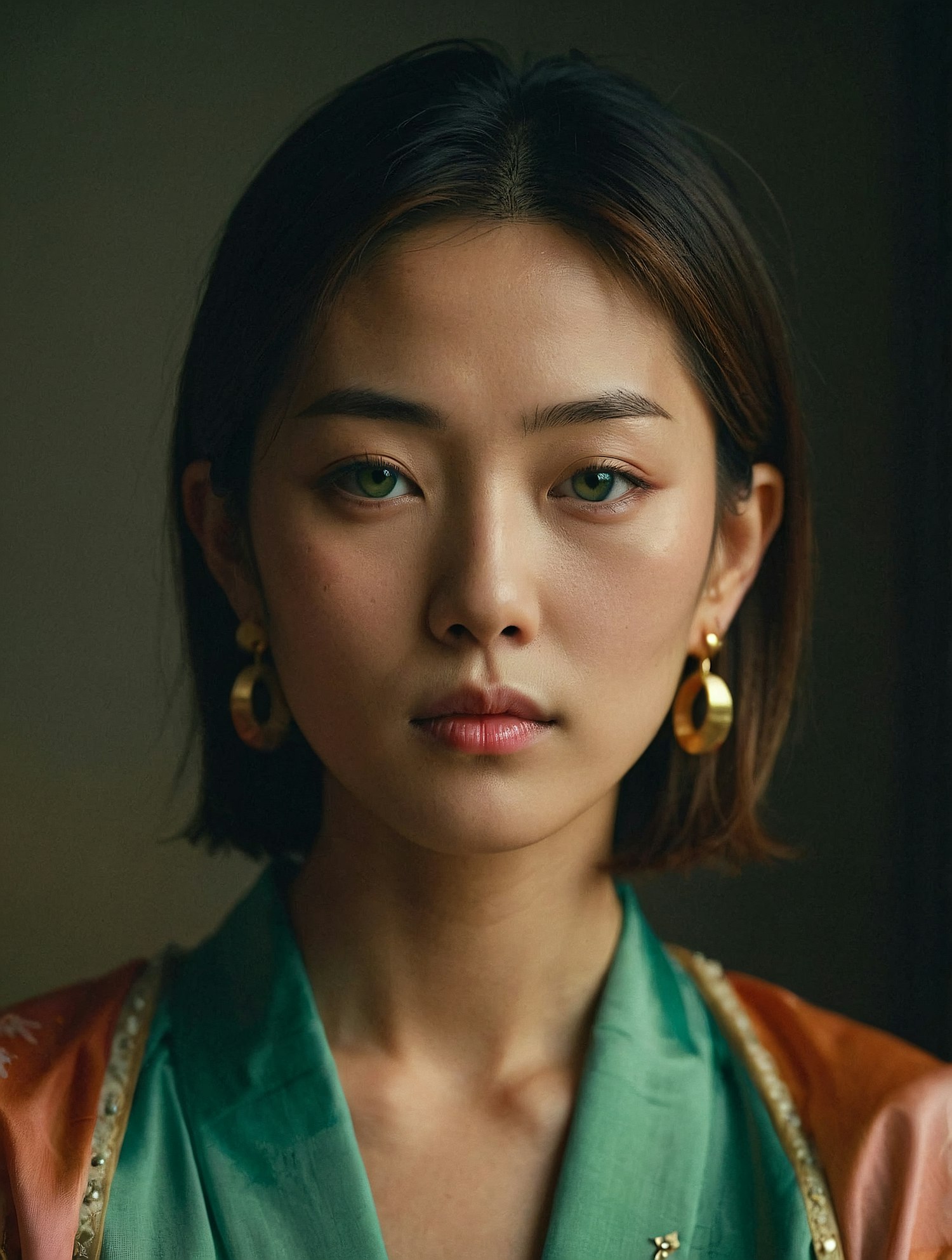 Portrait of an Asian woman with green eyes, gold hoop earrings, and colorful attire. Her calm expression and elegant style stand out.