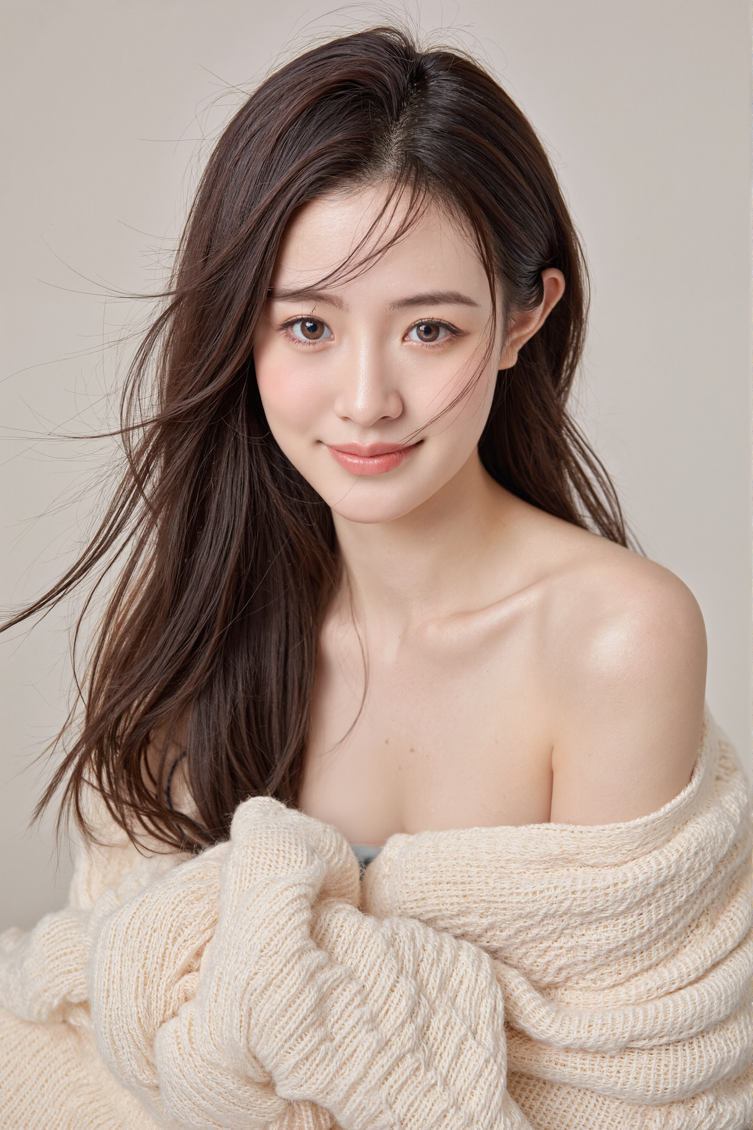 Portrait of a young woman with long dark hair, fair skin, and a cozy cream sweater, exuding warmth and natural beauty.