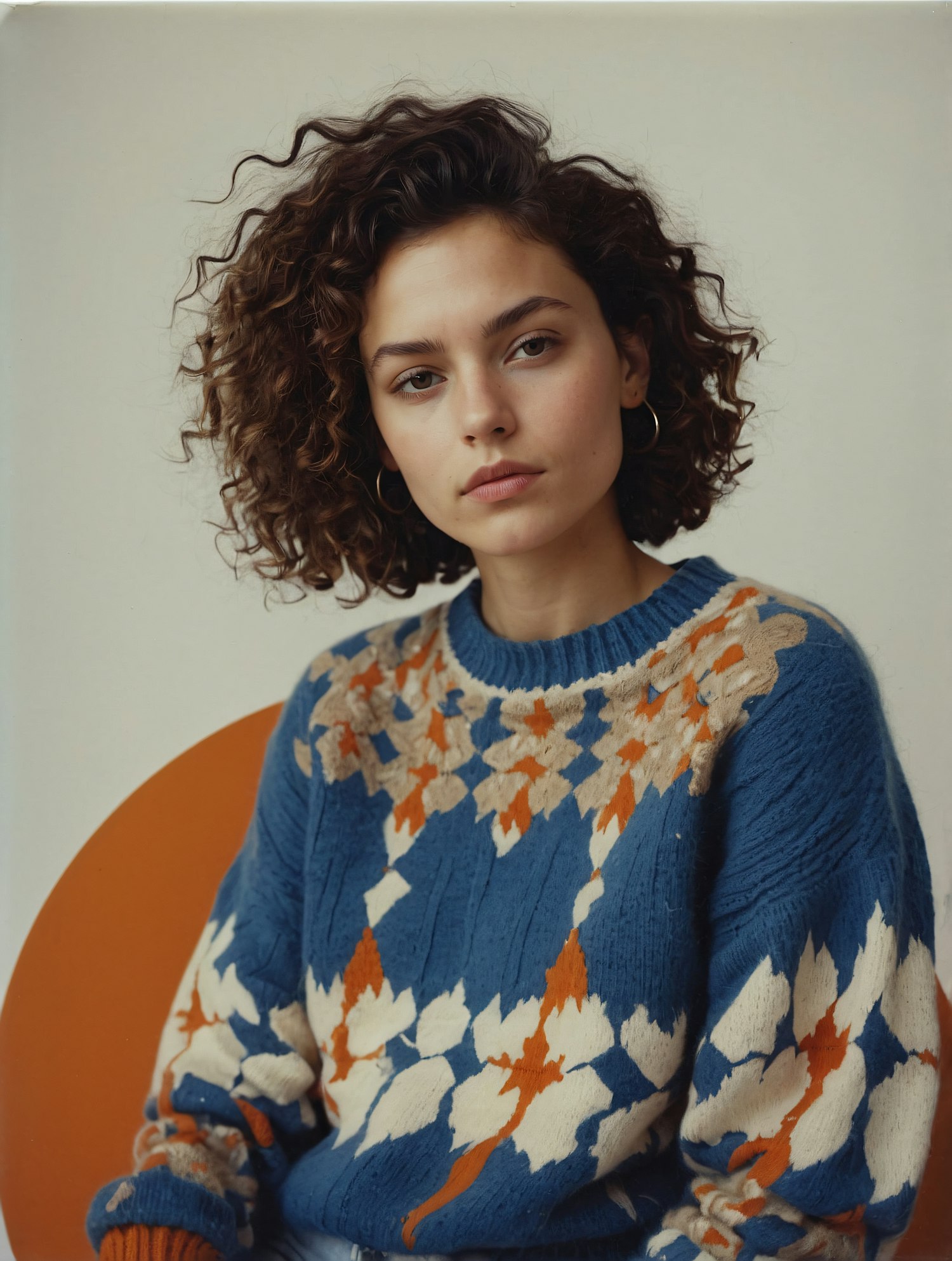 Portrait of a Young Woman in a Geometric Floral Sweater