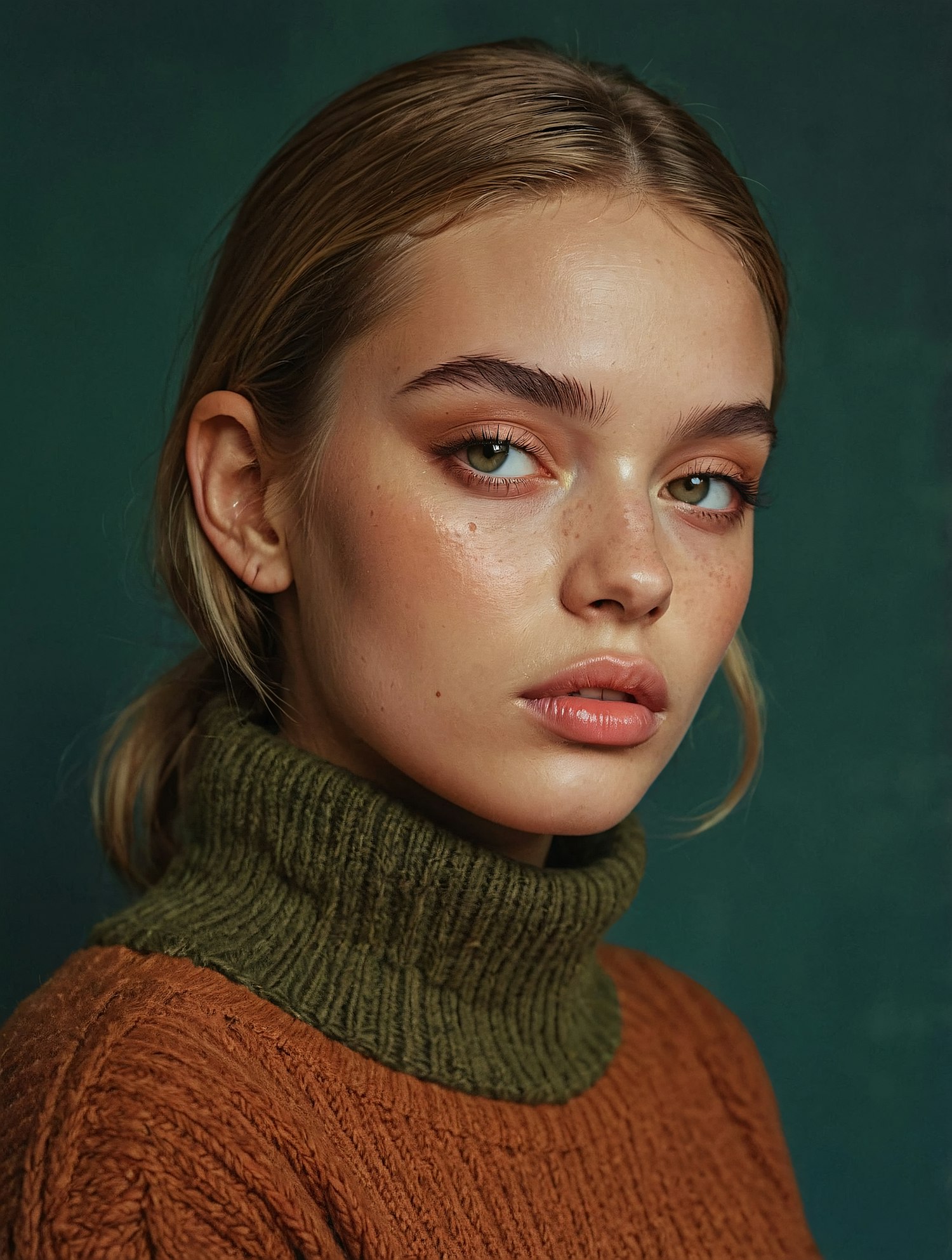 Close-up portrait of a young woman with green eyes, wearing a brown sweater and green turtleneck against a teal background.