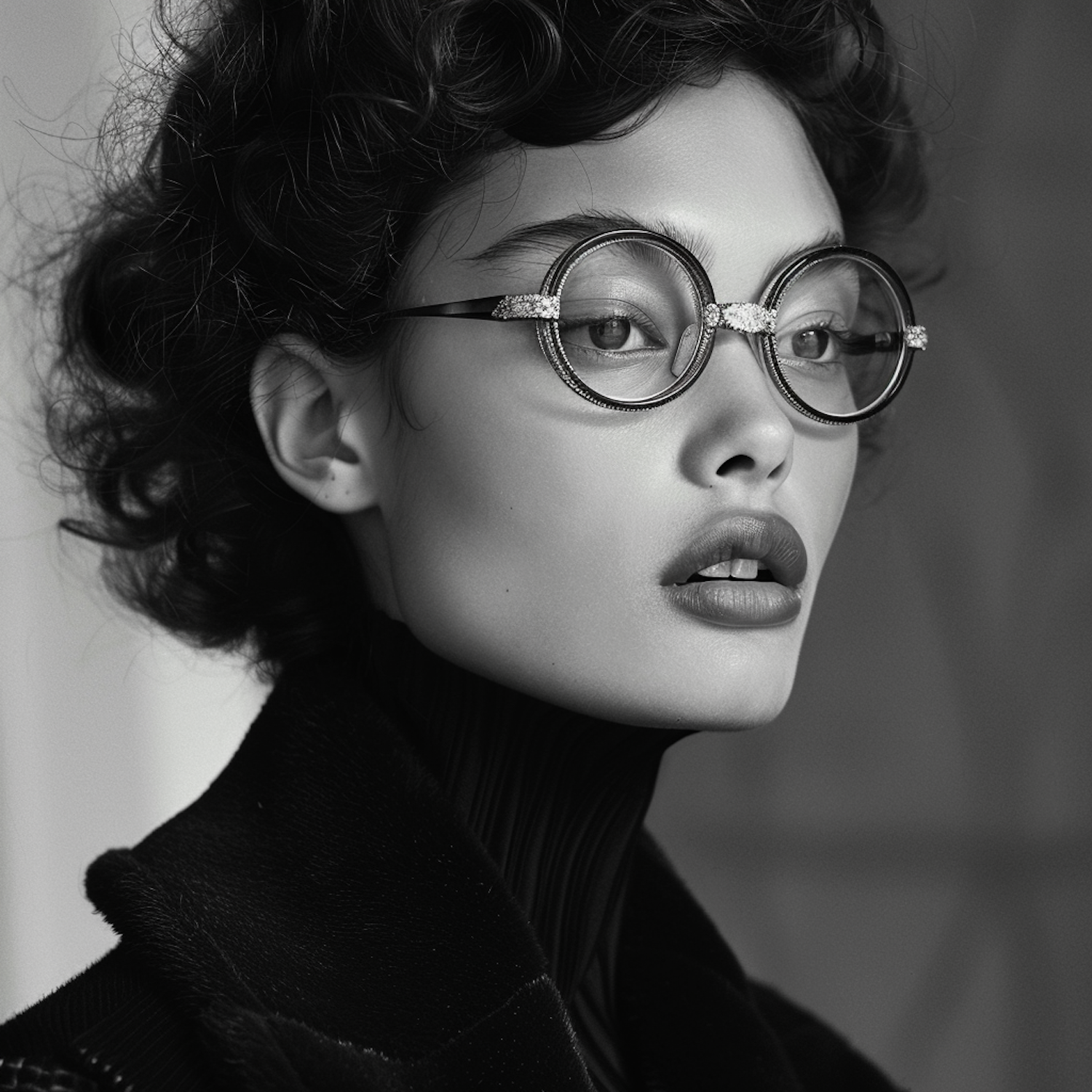 Elegant black and white portrait of a woman with round glasses and curly hair, exuding sophistication and style.