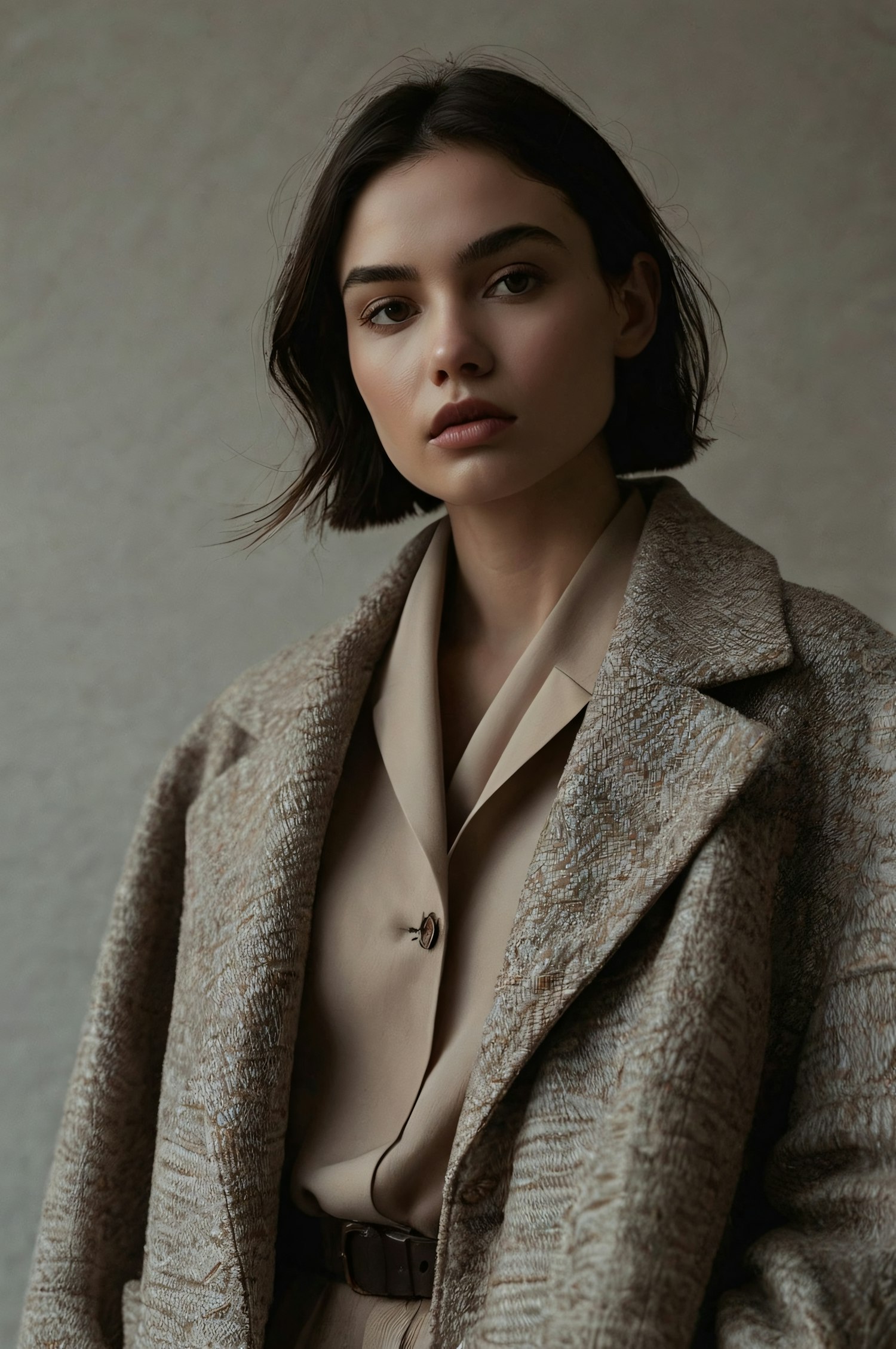 Stylish woman in a textured beige coat and blouse, exuding elegance with a calm expression and dark bob haircut.