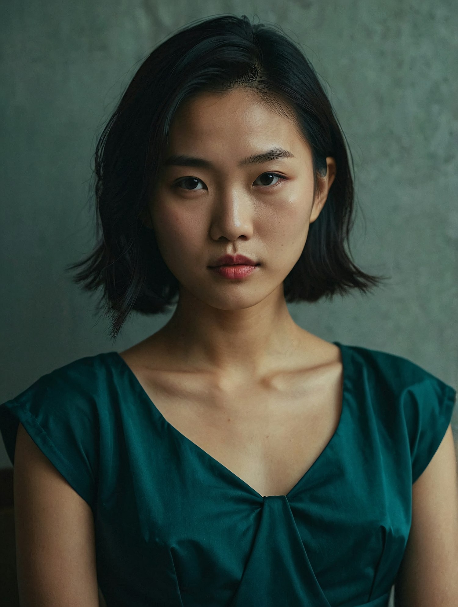 Portrait of an Asian woman in a green dress against a gray background, showcasing a calm expression and soft lighting.
