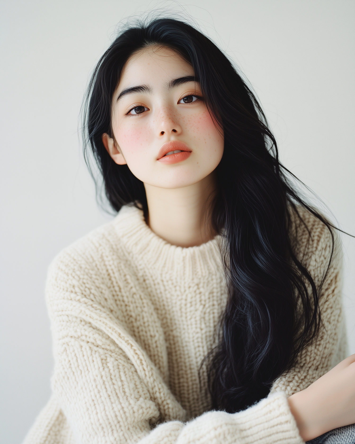 Asian woman in a cozy cream sweater with long black hair, gazing softly. Serene expression, fair skin, and gentle blush on cheeks.
