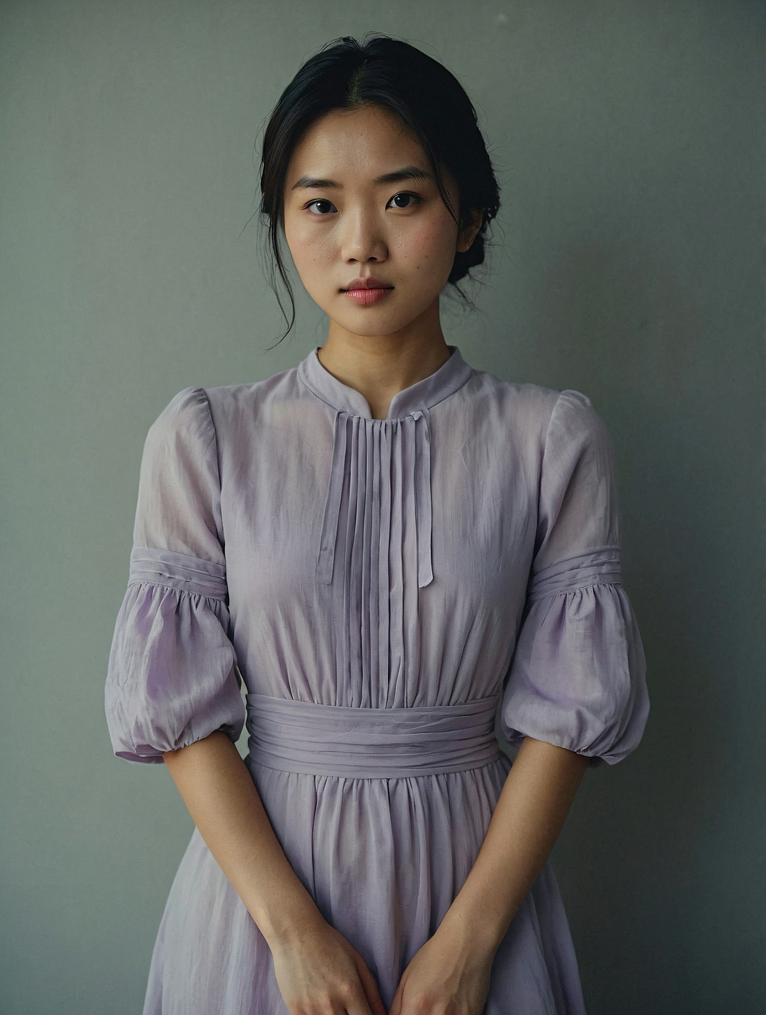 Asian woman in a lavender dress with puffed sleeves, standing calmly against a plain background, exuding elegance and poise.