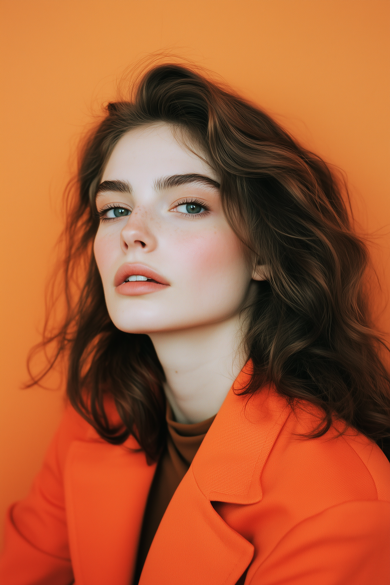 Portrait of a young woman with blue eyes and wavy brown hair in an orange blazer against an orange background.