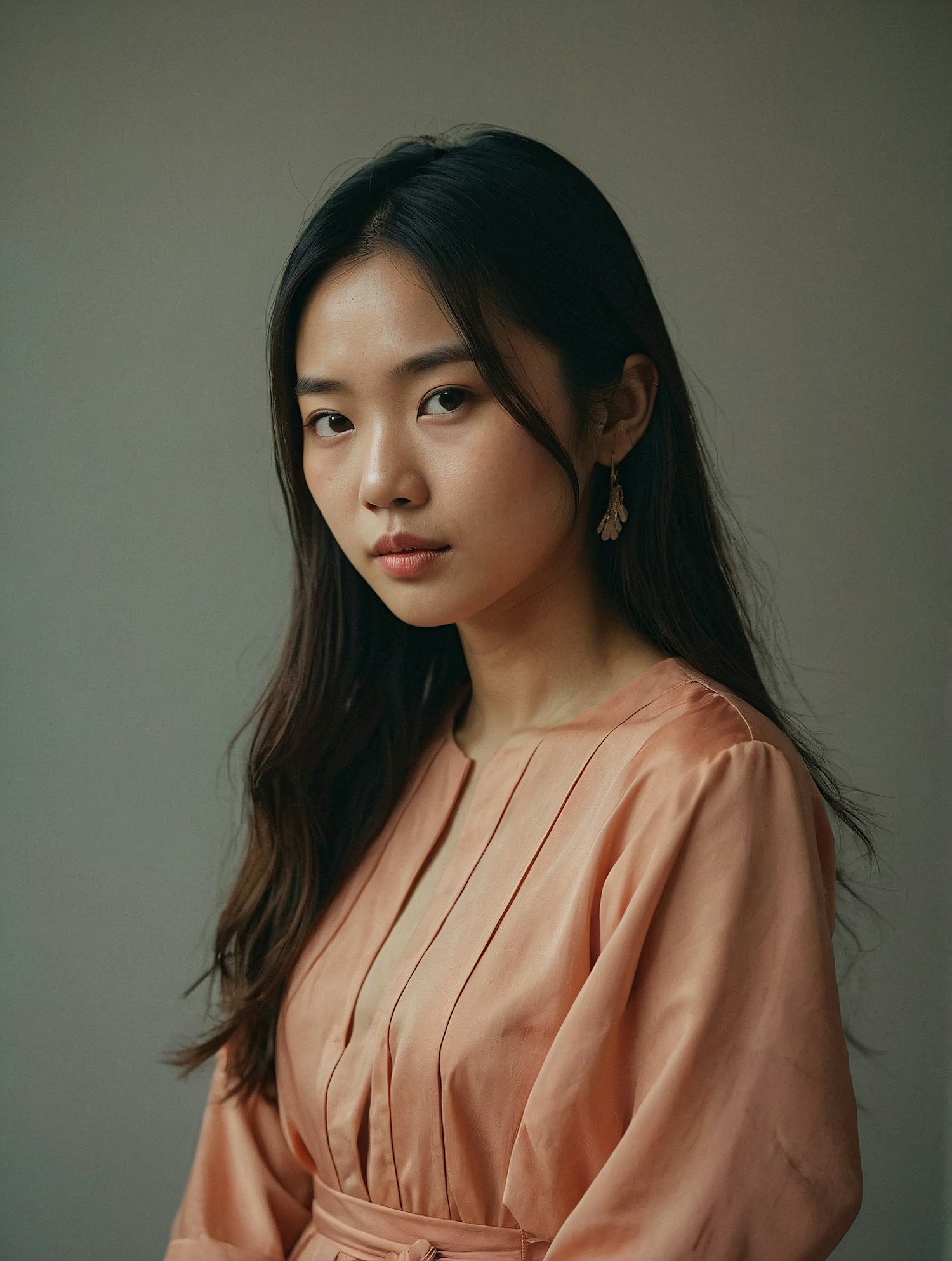 Asian woman in a peach blouse with long dark hair and gold earrings, gazing softly against a muted gray background.