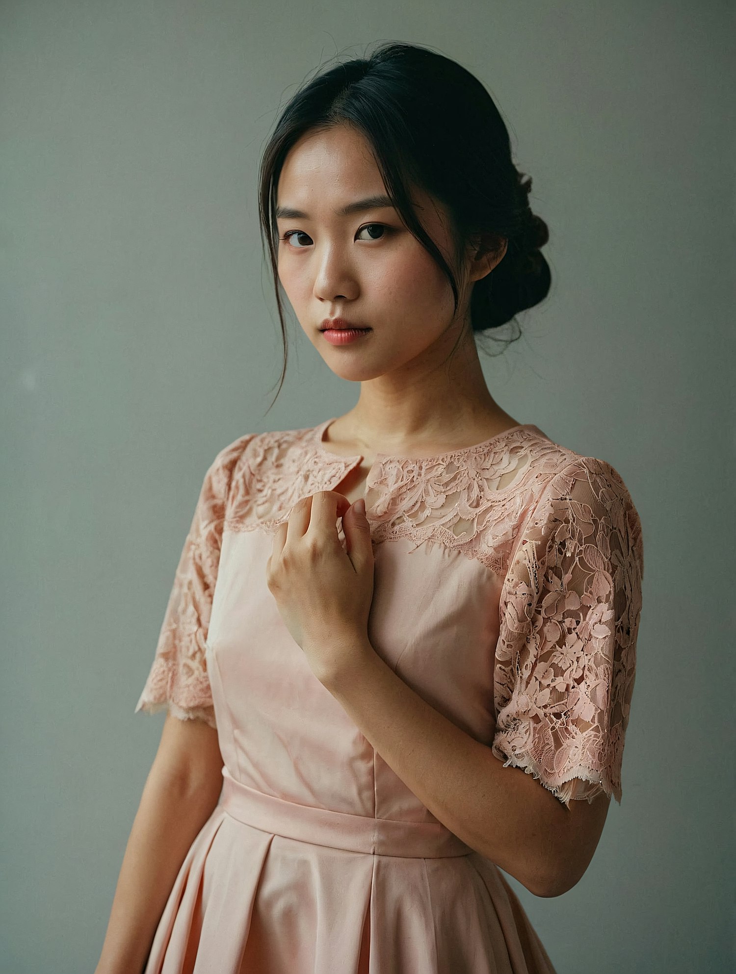 Elegant Asian woman in a pink lace dress with an updo hairstyle, posing gracefully against a muted gray background.