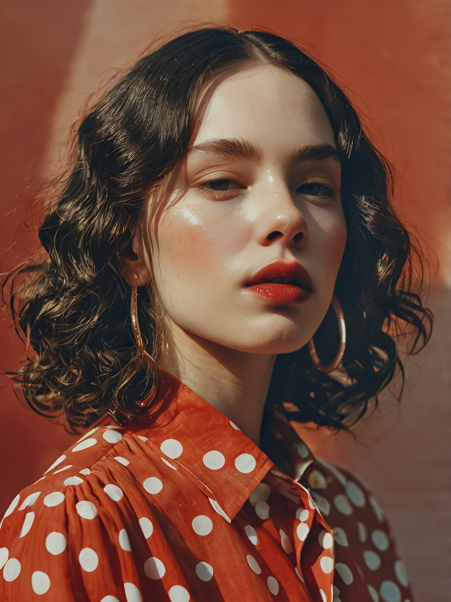 Stylish woman with wavy hair and red polka dot blouse, bold red lips, and hoop earrings against a warm background.