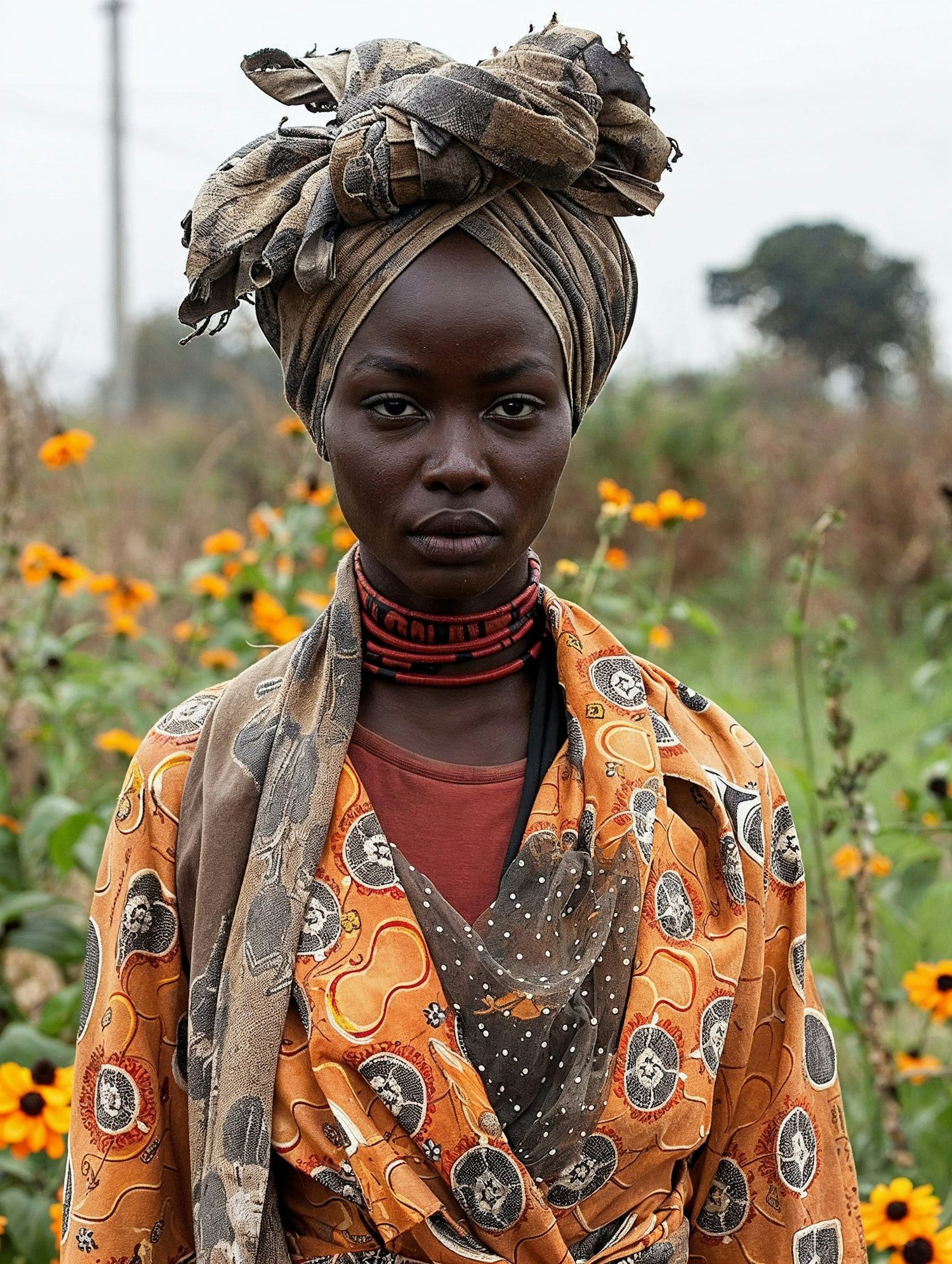 A woman in a patterned headscarf and vibrant attire stands in a field of orange flowers, exuding elegance and cultural richness.