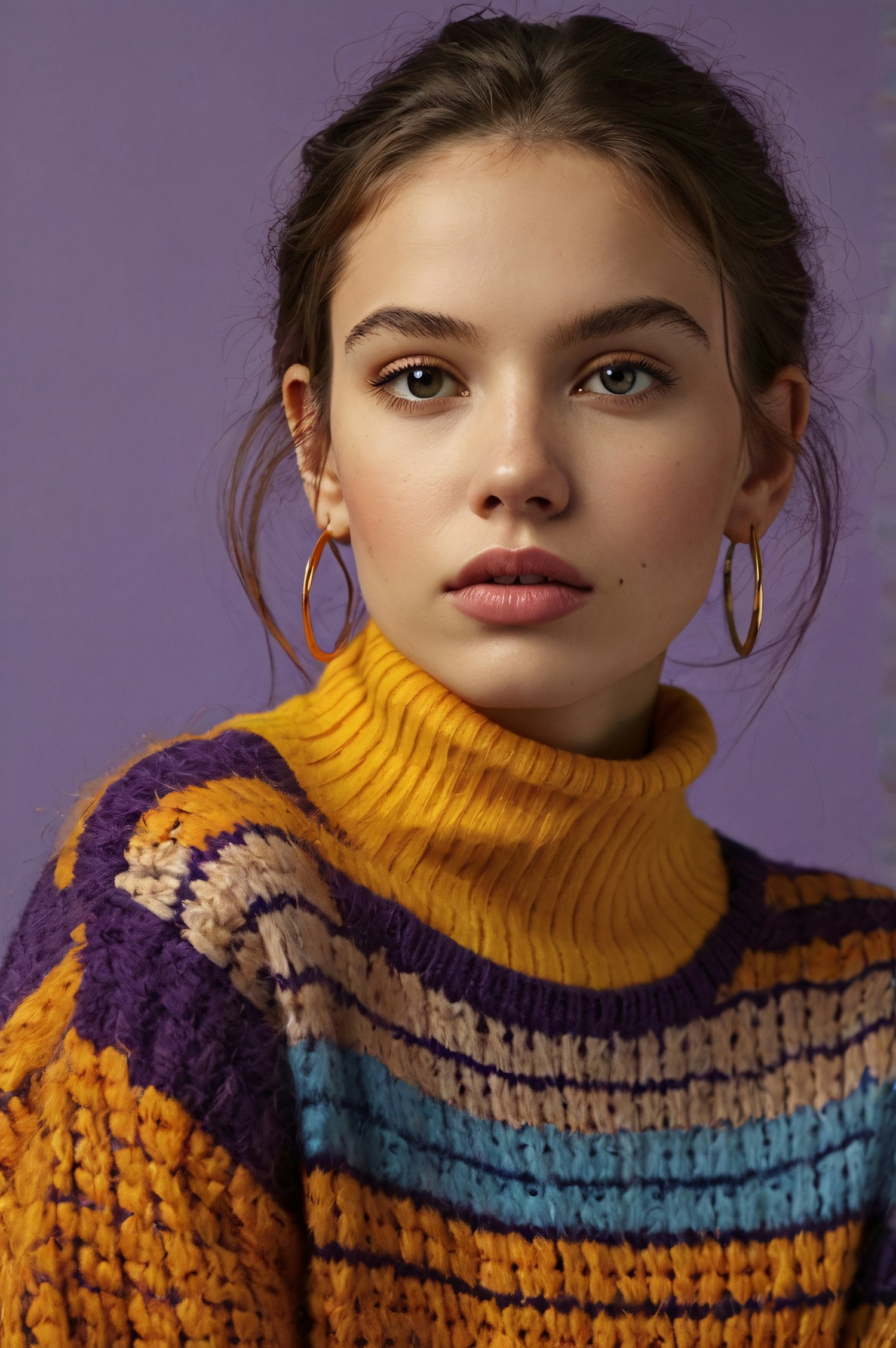 Young woman with hazel eyes and gold hoop earrings in a colorful striped sweater against a purple background.