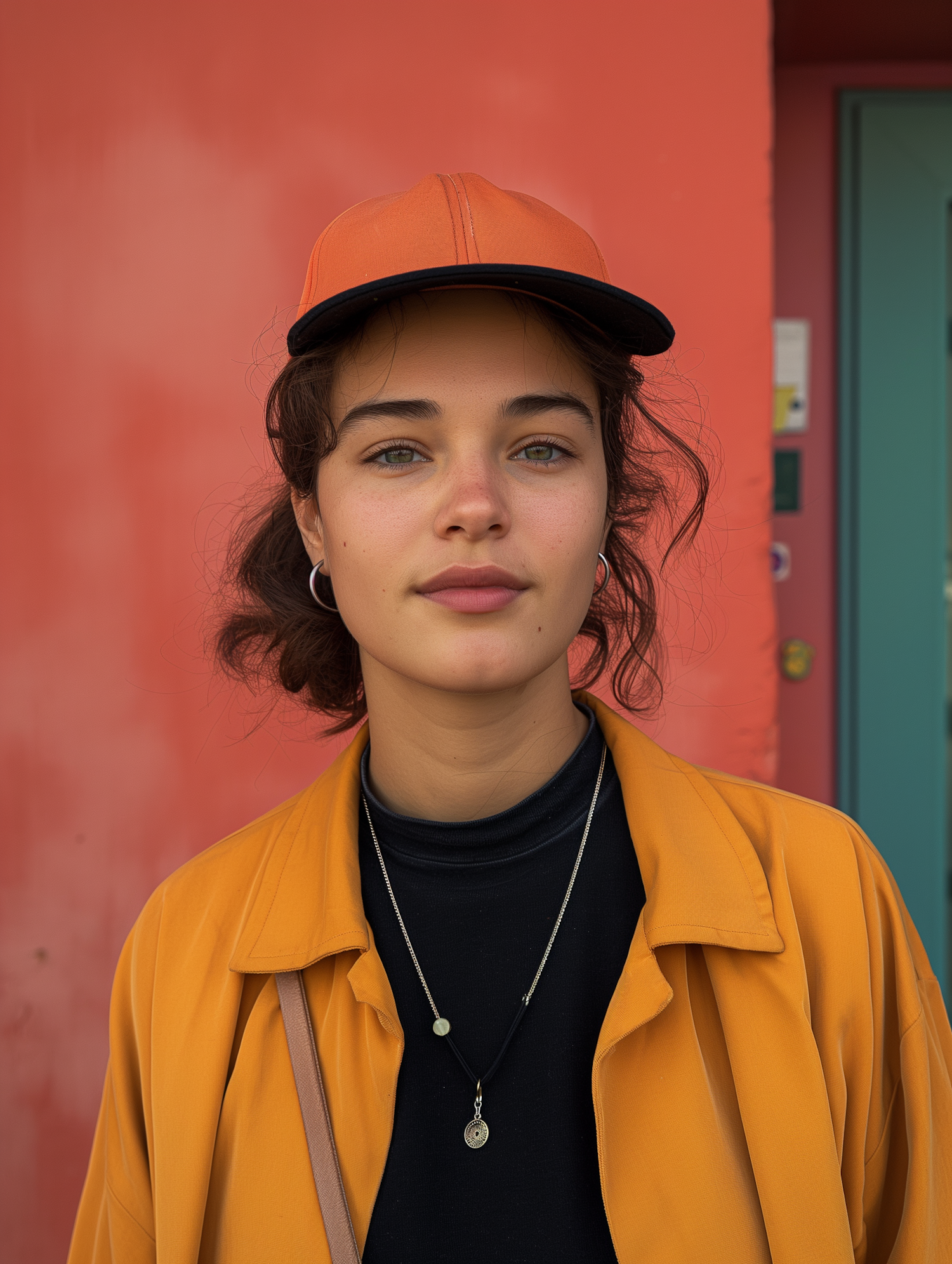 Young woman in orange cap and mustard jacket against a vibrant wall, exuding confidence and style.