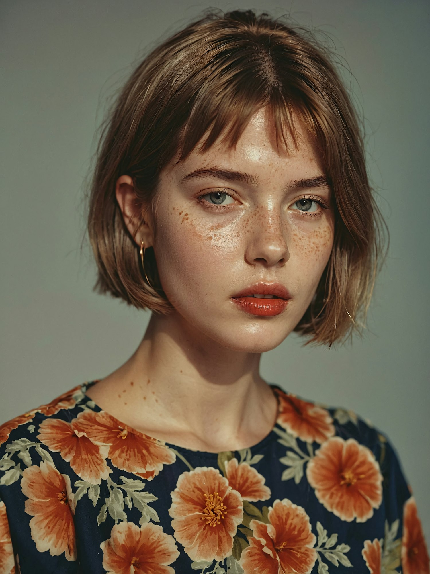 Portrait of a young woman with freckles, light brown hair, and floral top, exuding a serene and introspective expression.