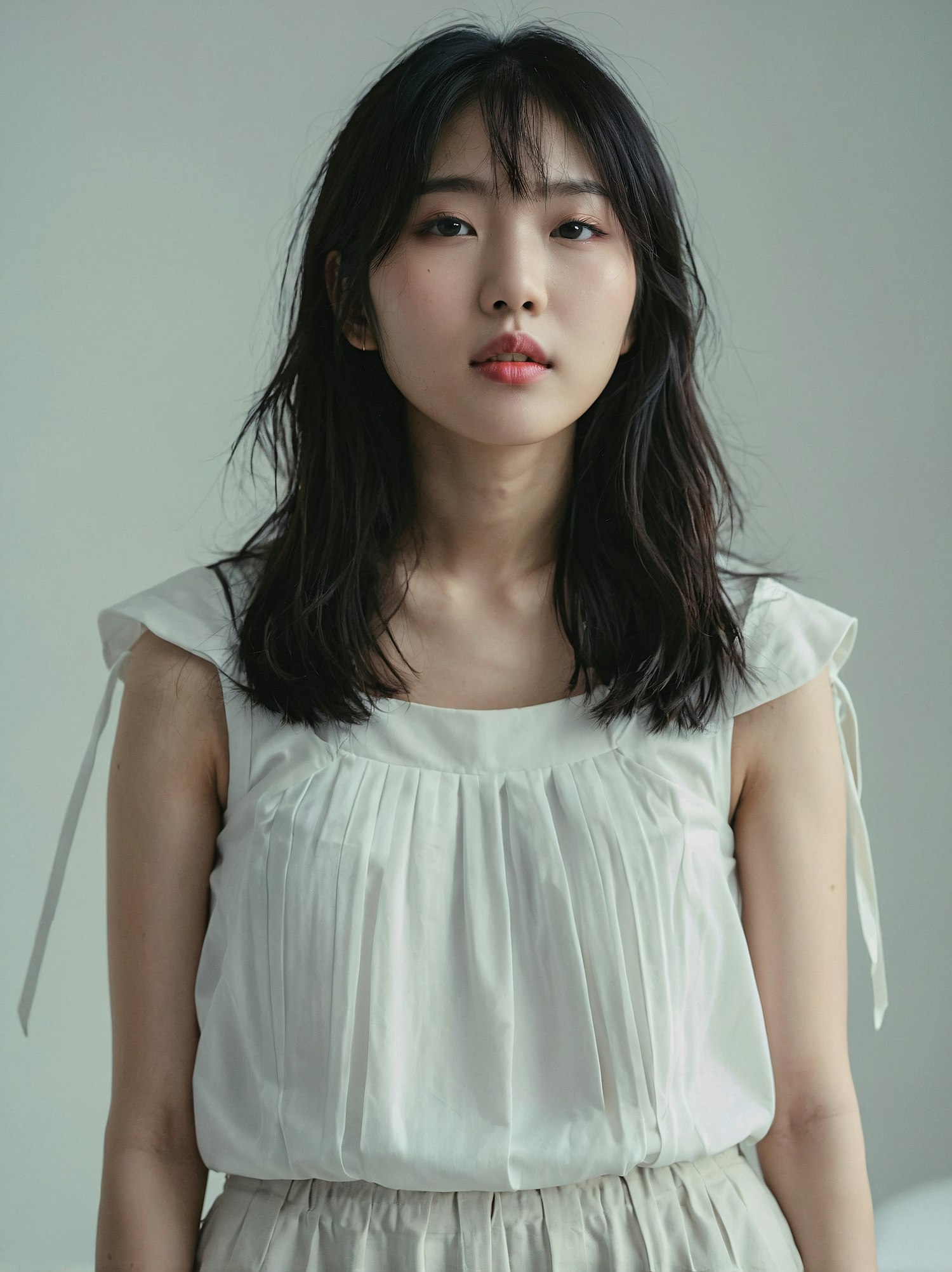 Asian woman with long dark hair in a white pleated blouse, standing against a soft gray background, exuding elegance and calm.