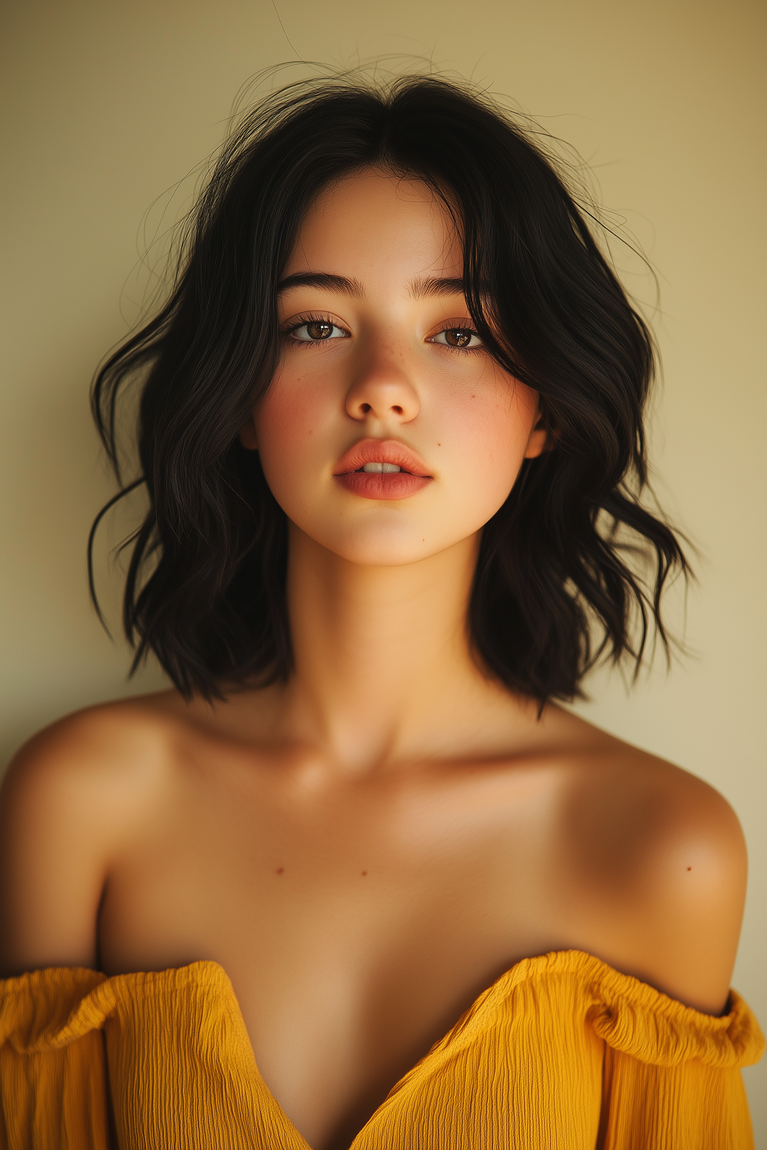 Portrait of a young woman with dark hair and a mustard yellow top, set against a beige background. Soft lighting enhances her features.