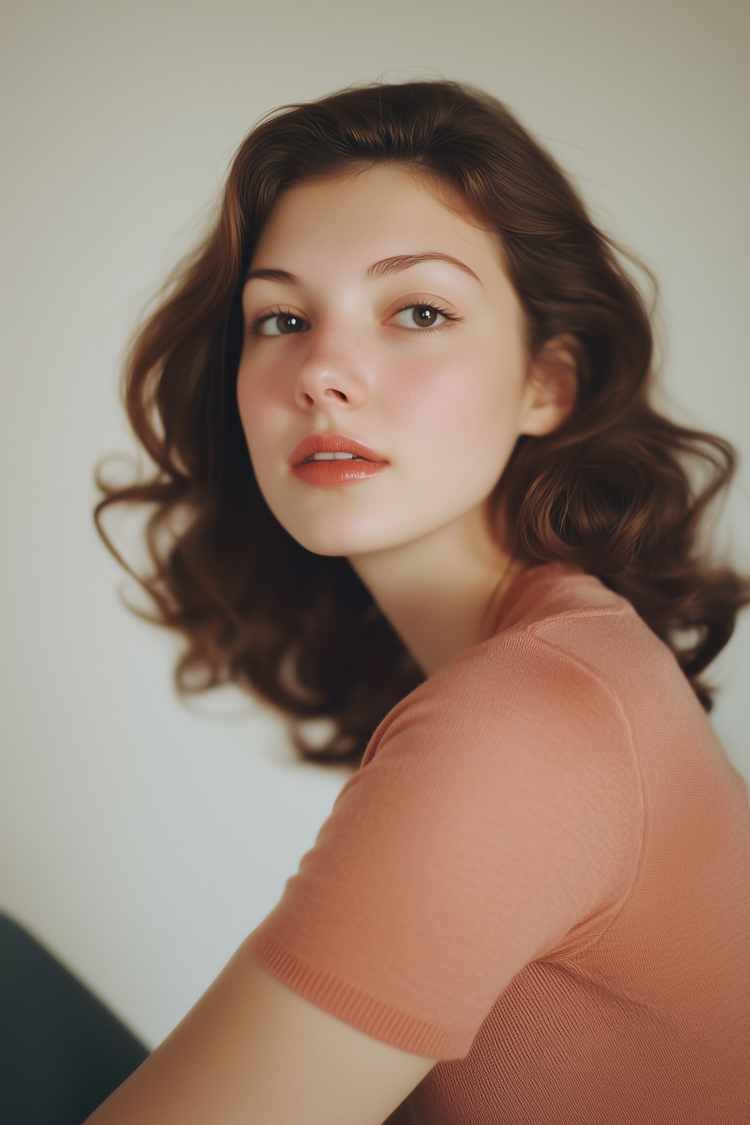 Portrait of a young woman with wavy brown hair and fair skin, wearing a peach top. Her serene expression and soft background create a calm vibe.