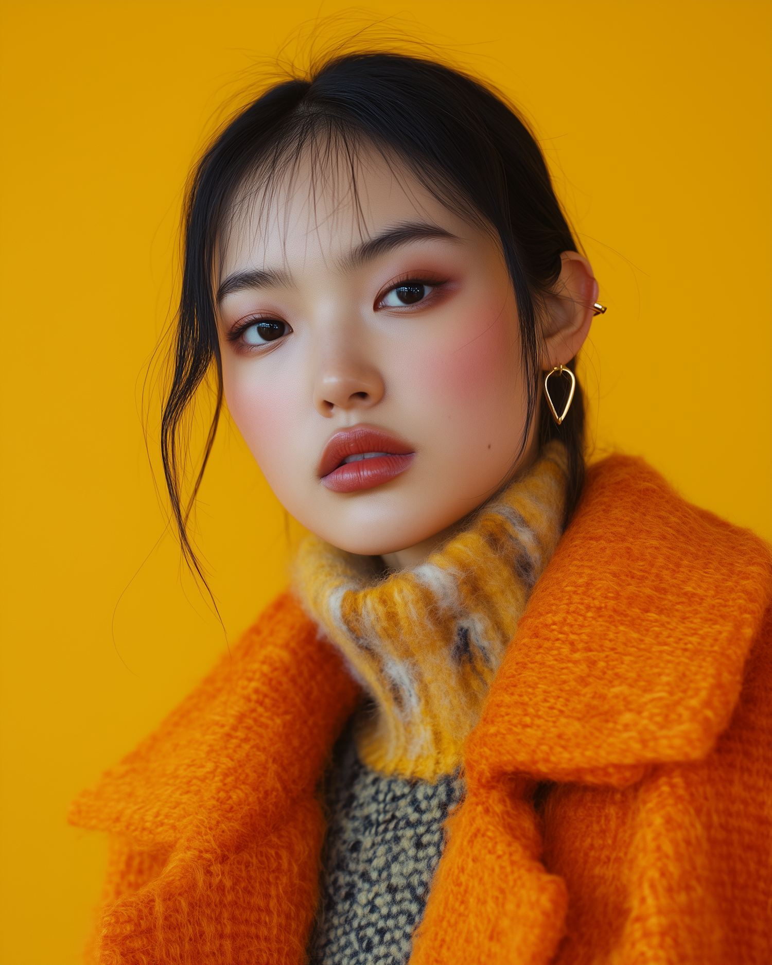 Asian woman in orange coat against a yellow background, wearing a teardrop earring. Striking contrast and elegant style.