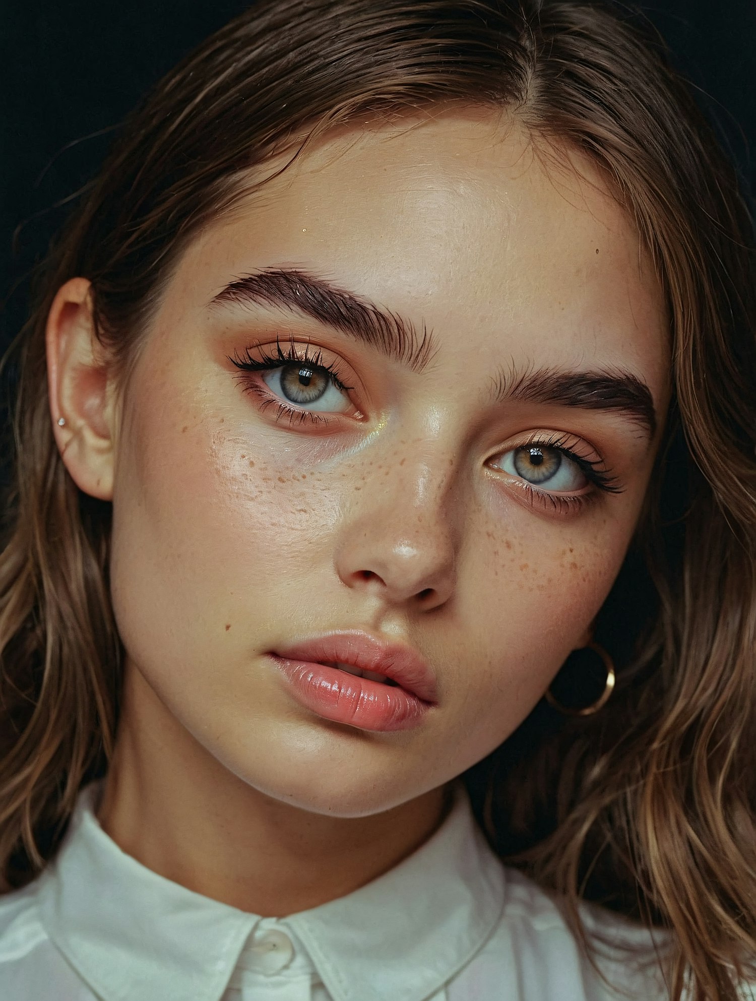 Close-up portrait of a young woman with blue eyes, brown hair, and a white shirt, set against a dark background.