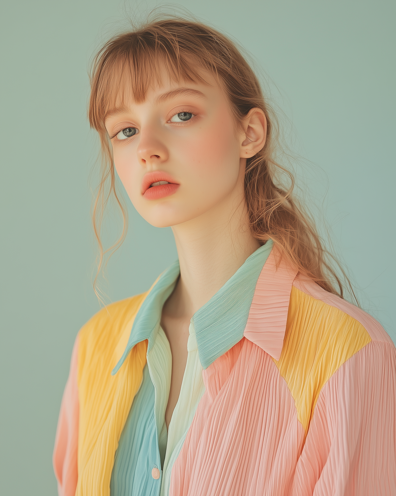 Young woman with blonde hair in pastel pleated blouse against teal background, exuding a serene and delicate vibe.