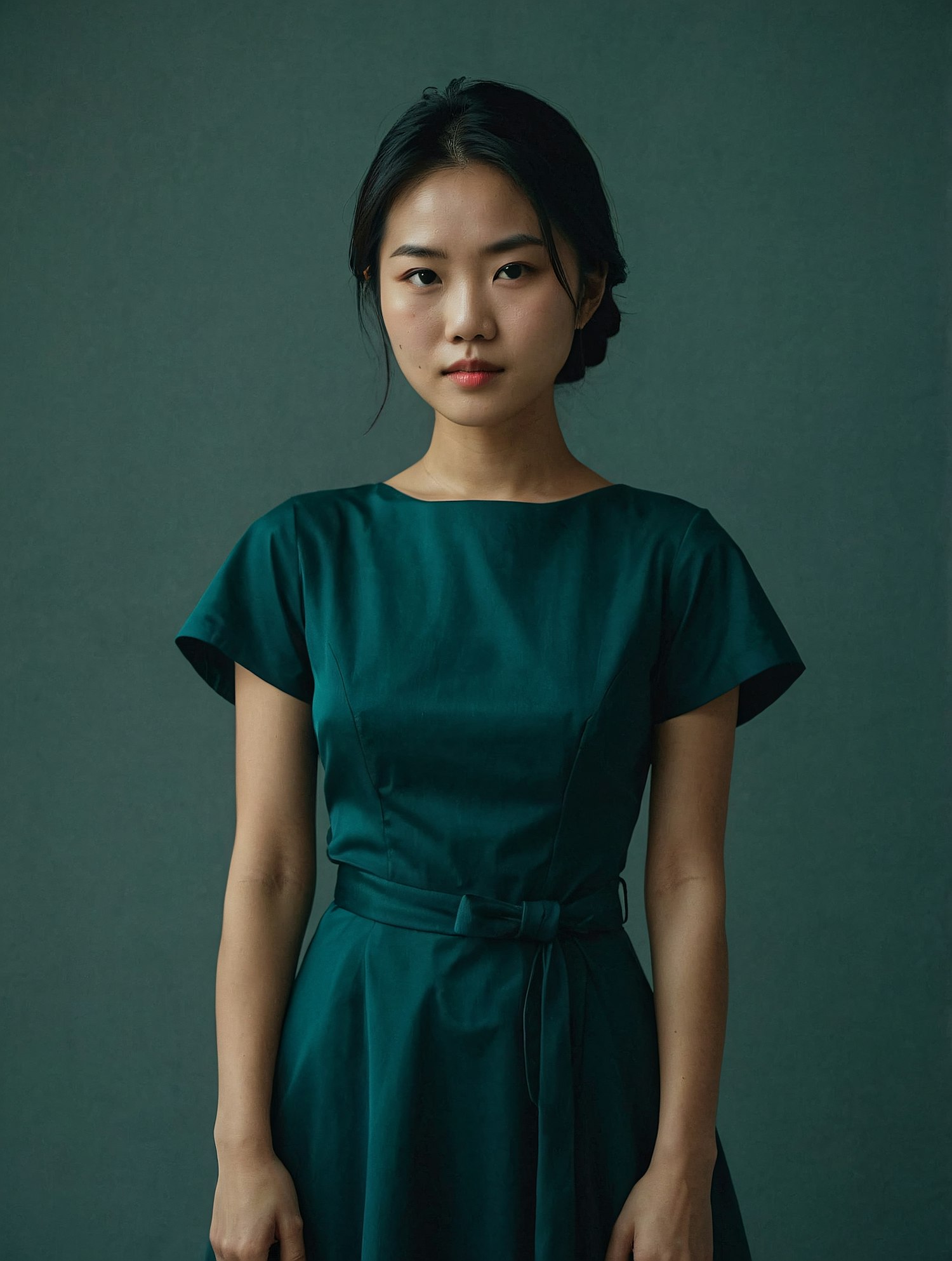 Asian woman in a dark green dress with an elegant updo, standing against a muted green background, exuding calm and poise.