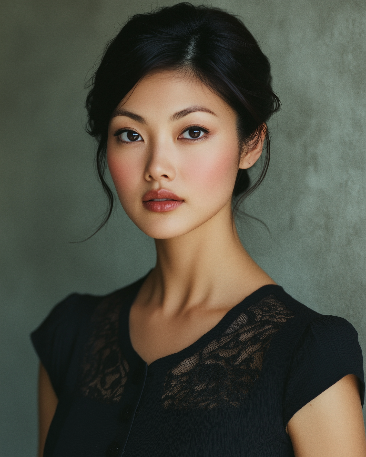 Elegant Asian woman with dark hair and lace top, gazing calmly with a serene expression against a muted gray background.