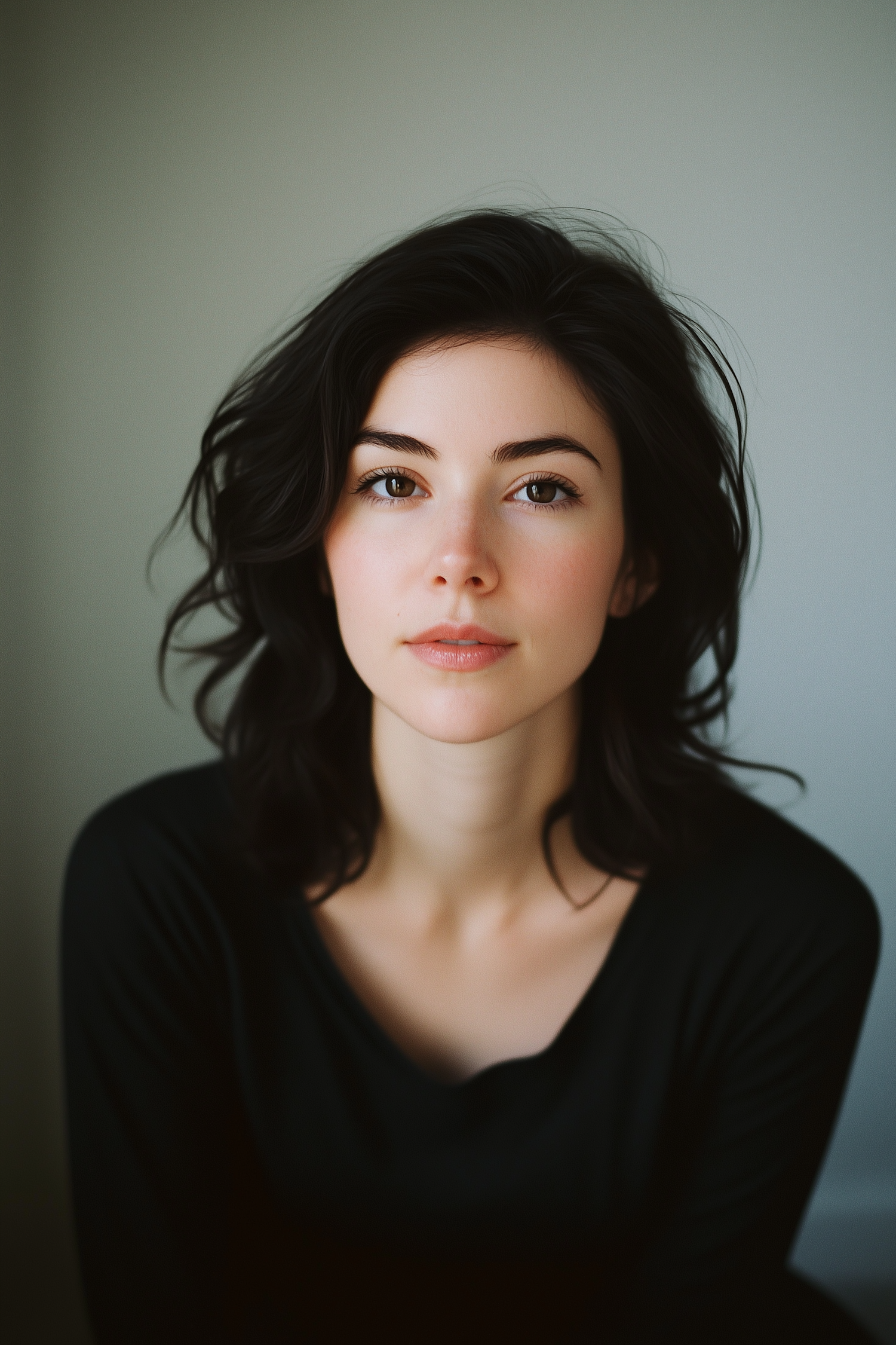 Portrait of a young woman with dark hair and serene expression against a neutral background, wearing a black top.