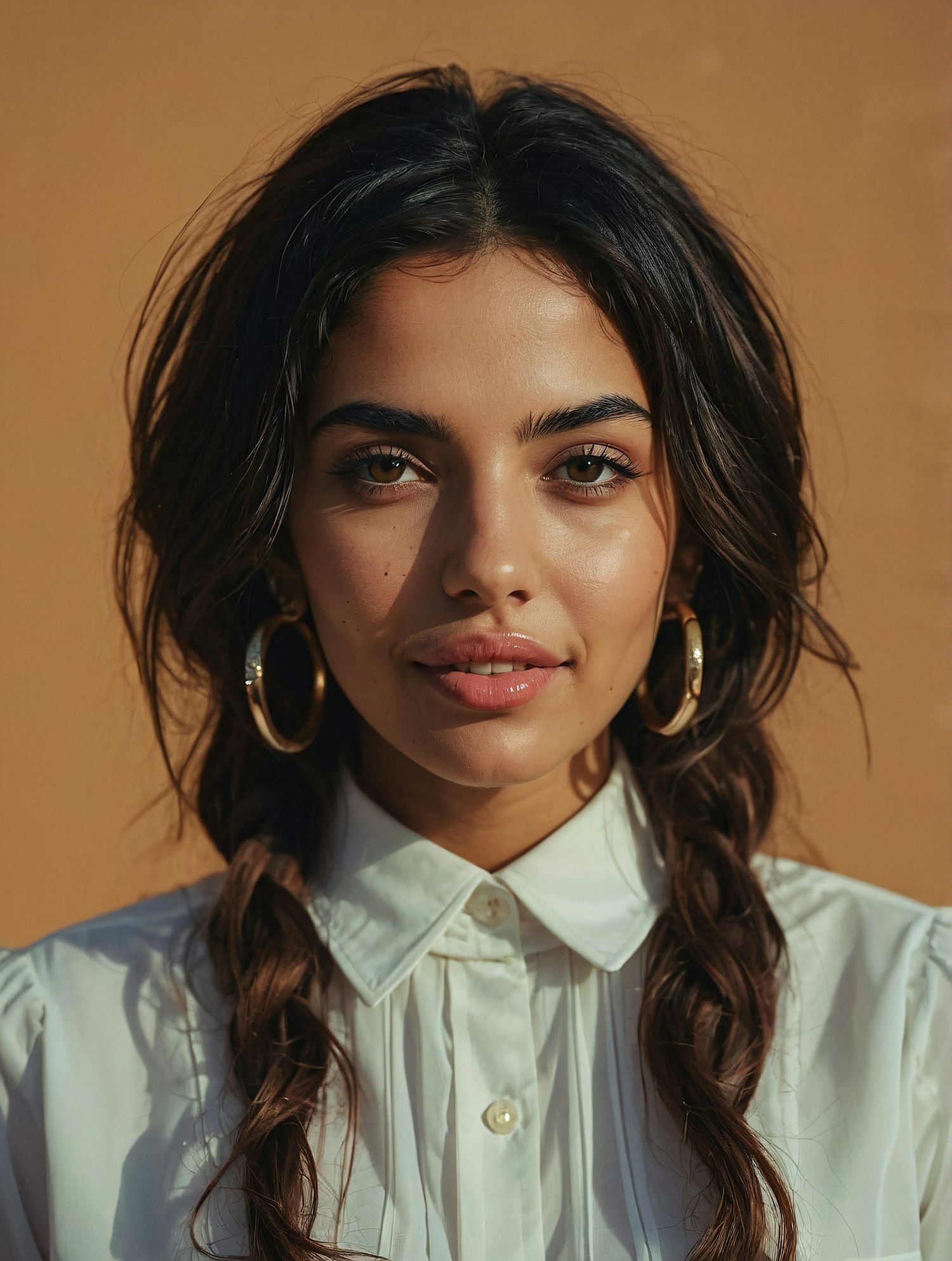 Portrait of a young woman with dark hair, wearing a white shirt and gold hoop earrings against a beige background.