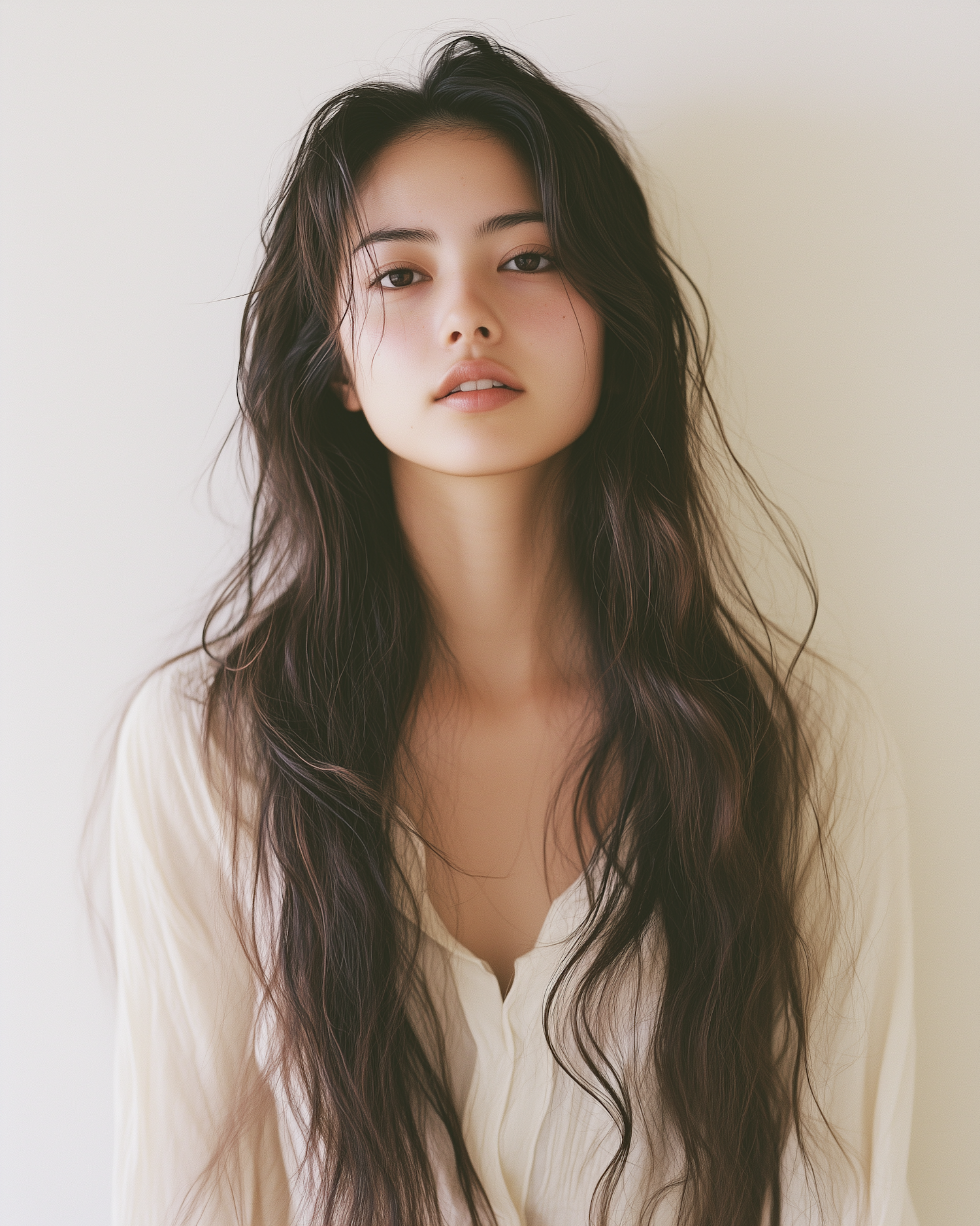 Portrait of an Asian woman with long wavy hair and serene expression, wearing a light blouse against a plain background.