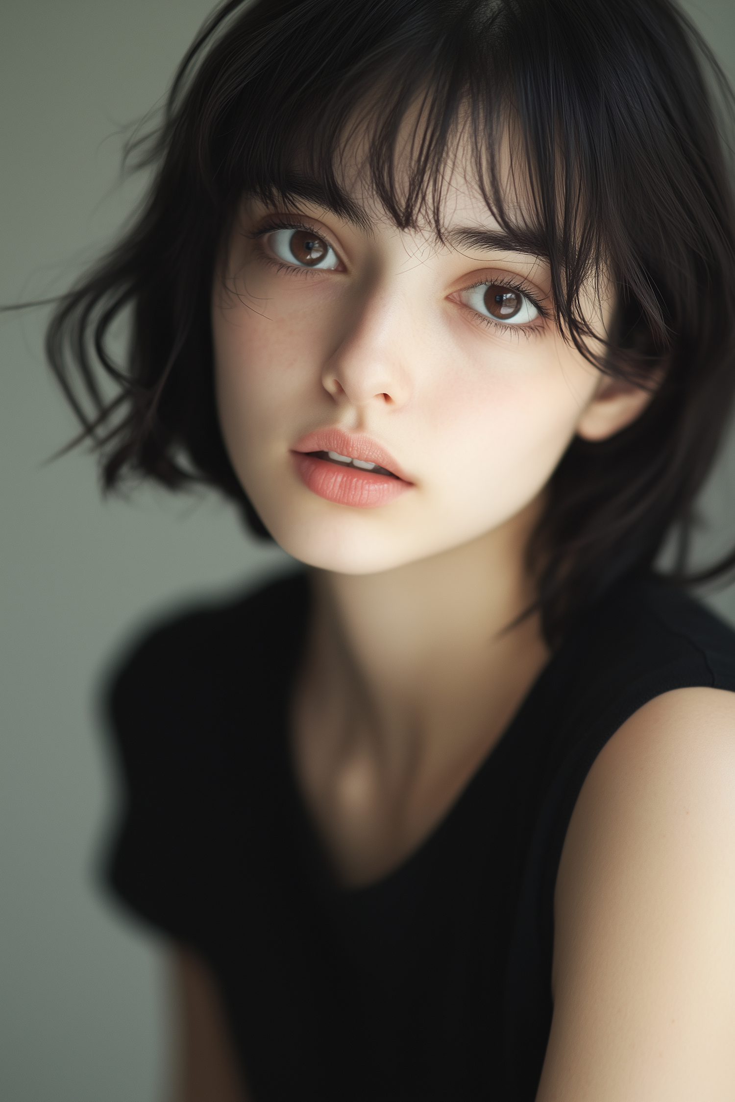 Portrait of a young woman with short black hair, fair skin, and expressive brown eyes, wearing a black top against a neutral background.