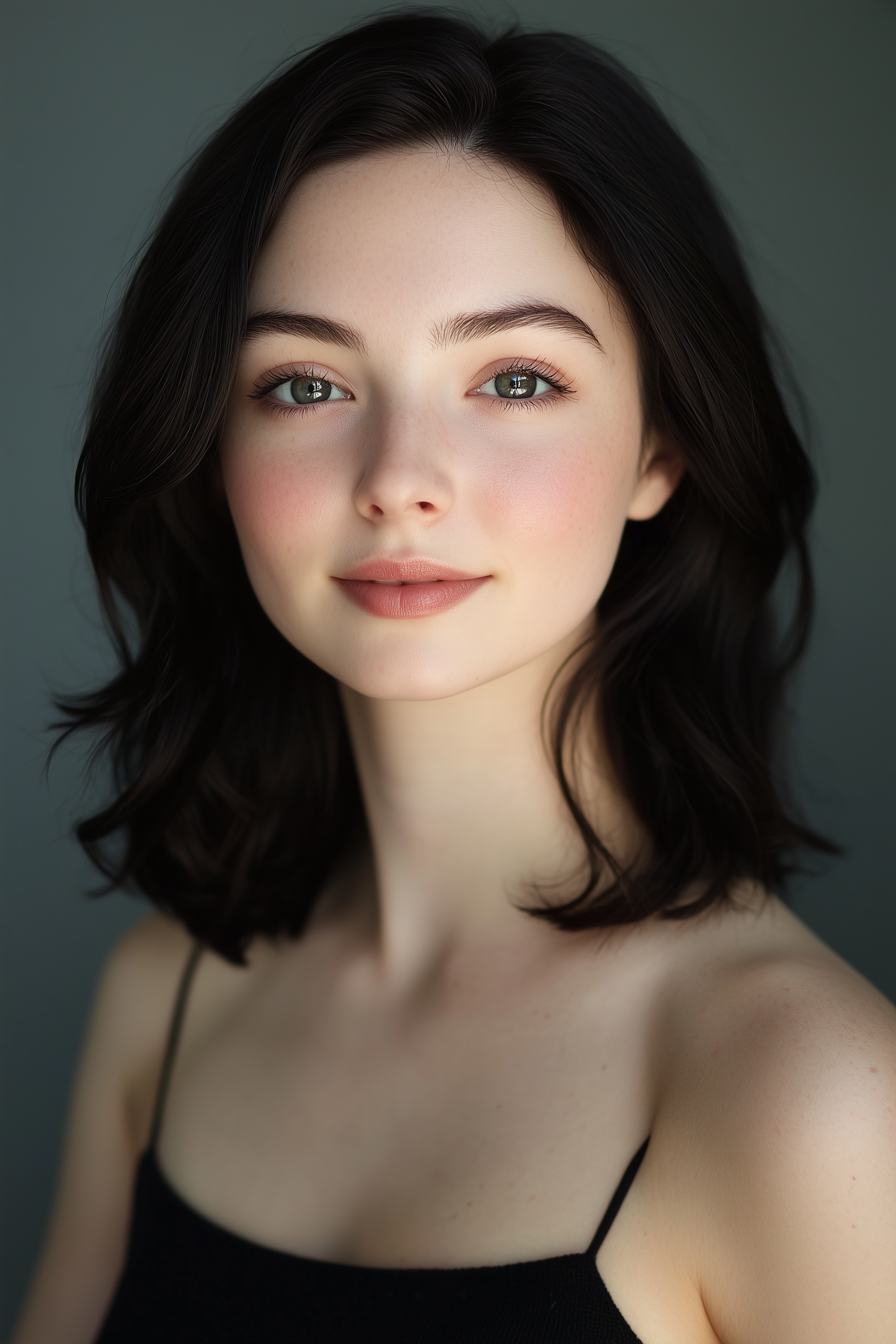 Portrait of a young woman with dark brown hair, green eyes, and a natural complexion, wearing a black top against a muted green background.