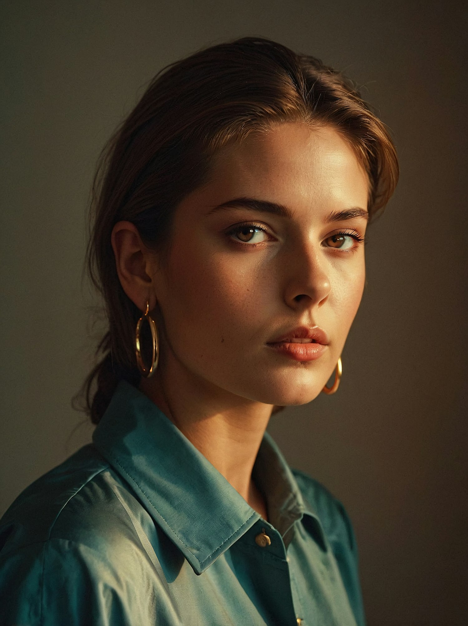 Portrait of a young woman with light brown hair, gold hoop earrings, and a teal shirt, set against a warm, softly lit background.