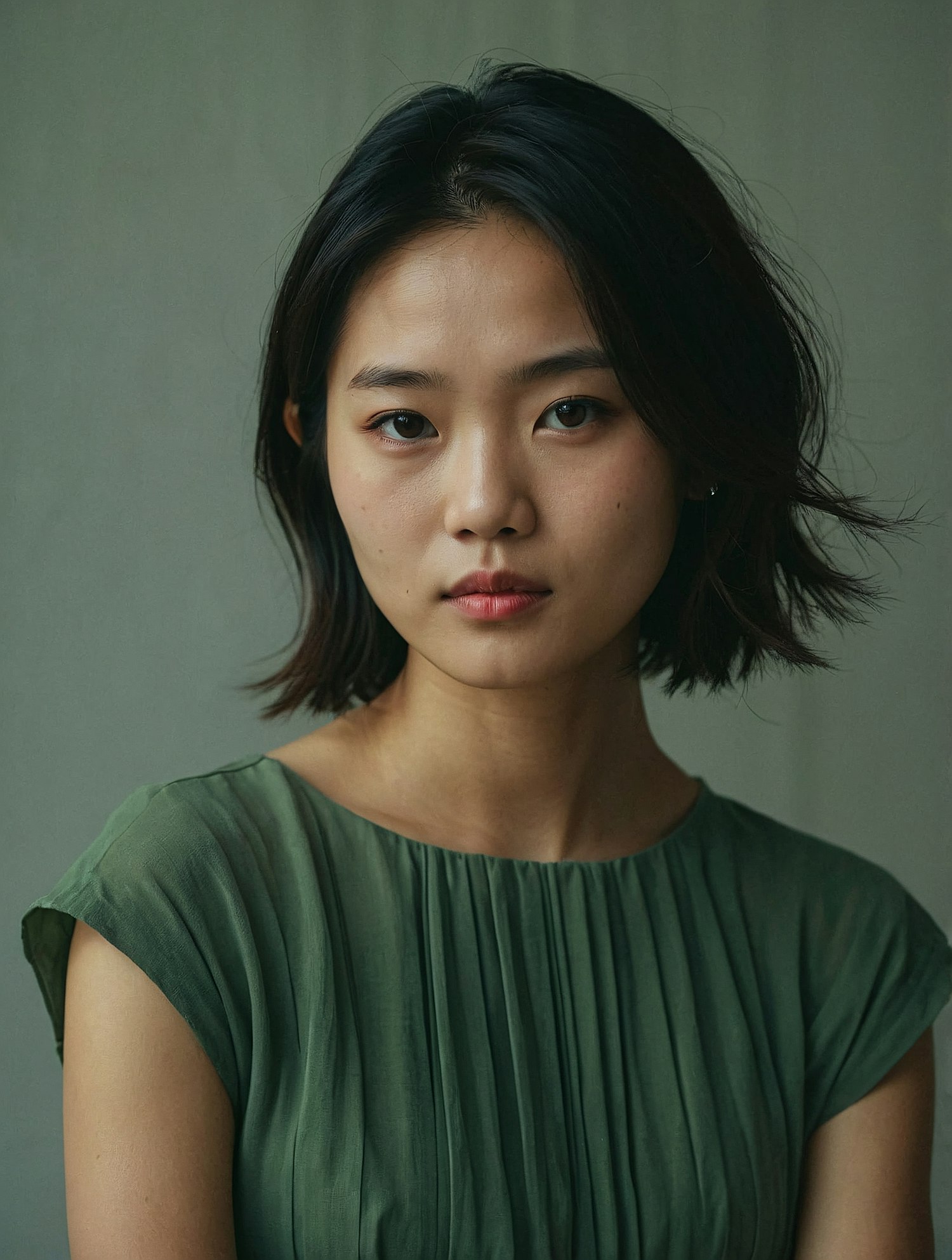 Portrait of an Asian woman in a green dress, with a calm expression and shoulder-length dark hair against a soft gray background.