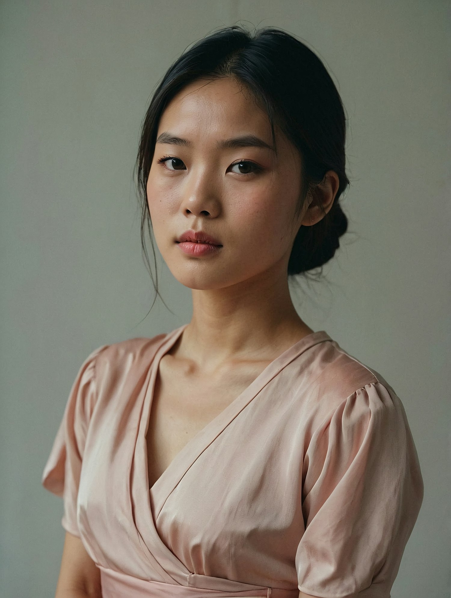 Portrait of an Asian woman in a pink dress with a serene expression, styled hair, and a plain background.